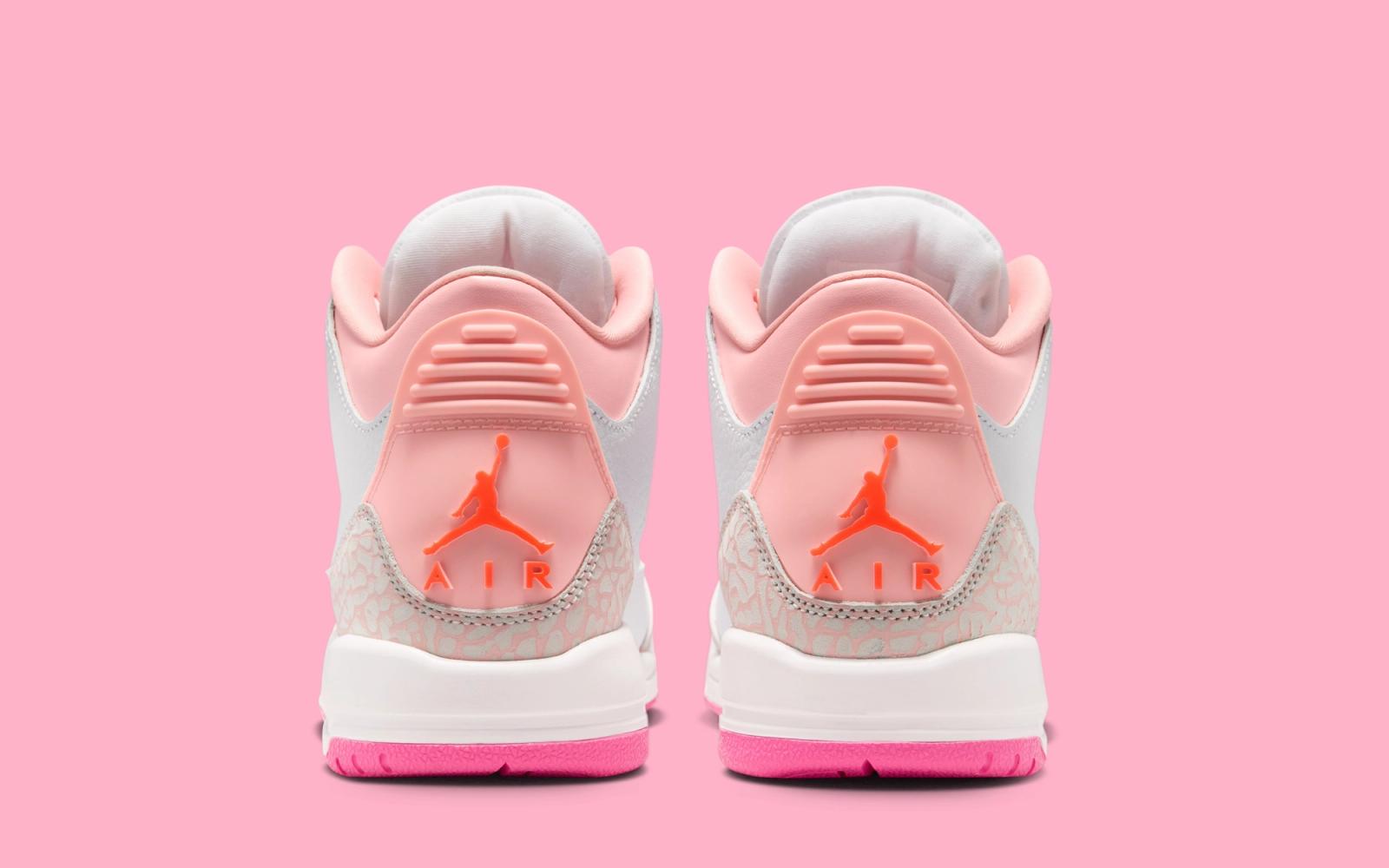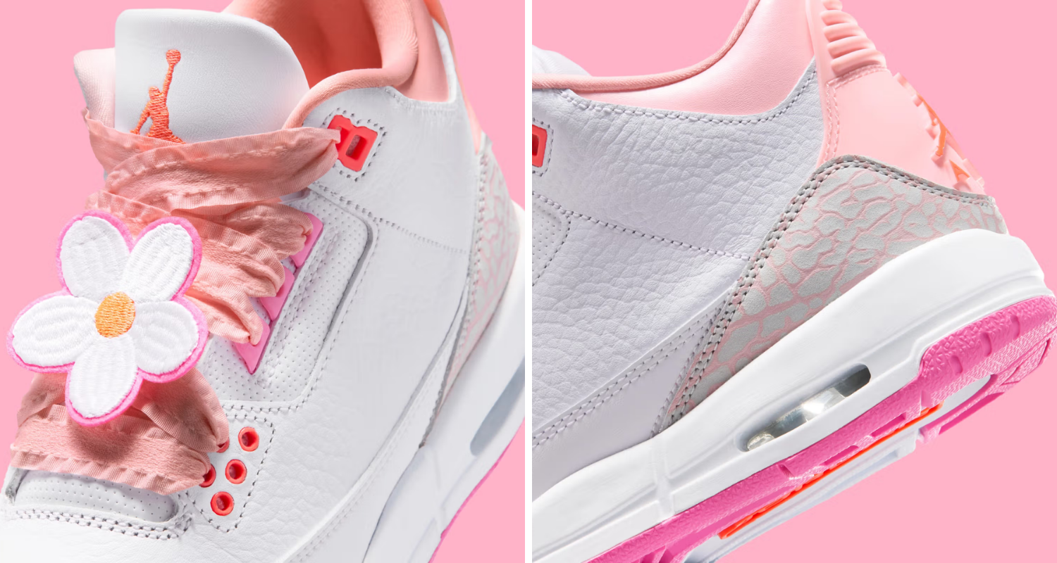 Air Jordan 3 “Spring Flowers” vẫn giữ nguyên cấu trúc cơ bản của dòng Air Jordan 3, với upper da trắng làm nền chủ đạo. Trên đó, các chi tiết màu hồng được phân bổ ở phần lót trong, gót giày và outsole, tạo cảm giác nhẹ nhàng và dễ tiếp cận.