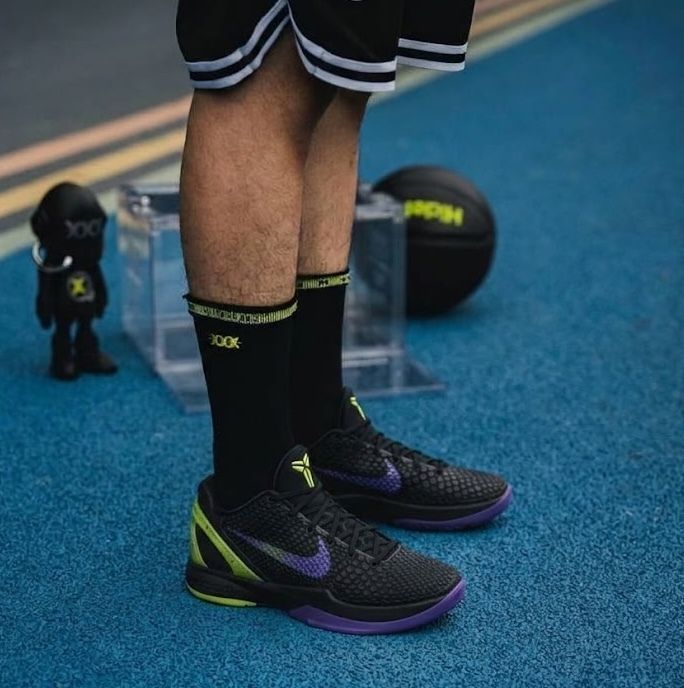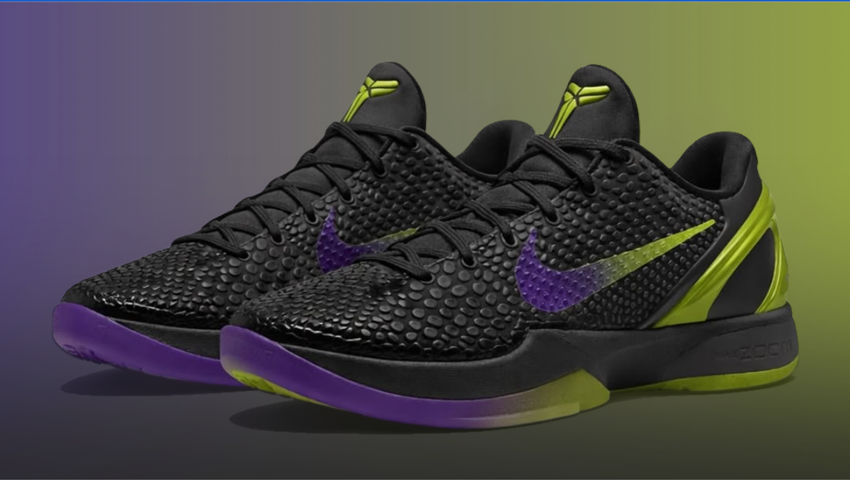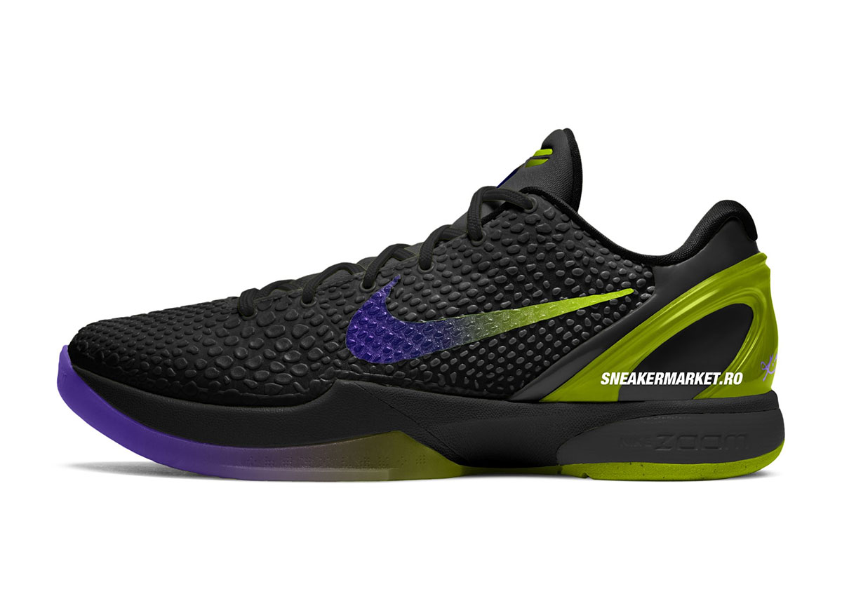 Điểm nhấn nằm ở logo Swoosh chuyển màu giữa tím và xanh lá, kết hợp cùng phần gót xanh lá sáng và outsole tím nổi bật. Tổng thể tạo nên diện mạo táo bạo nhưng vẫn giữ được DNA quen thuộc của Kobe 6.