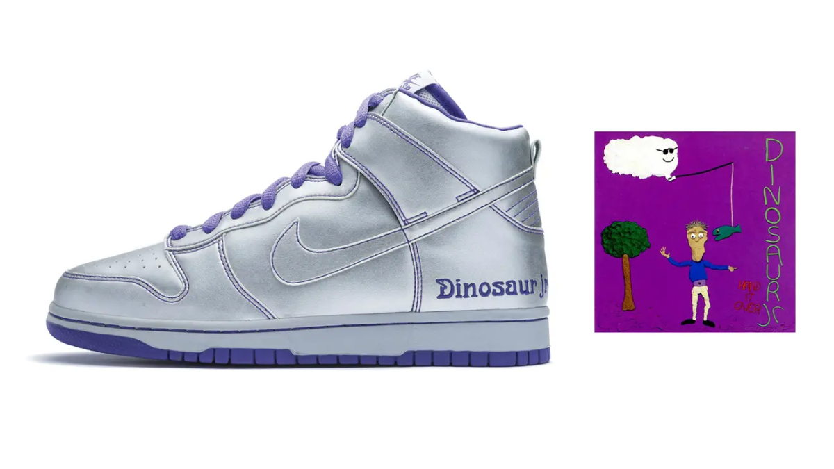 Nike SB hợp tác với J Mascis, thủ lĩnh Dinosaur Jr., vào năm 2007 để tạo ra đôi SB Dunk High đáng nhớ lấy cảm hứng từ nhạc glam rock thập niên 70. Đôi Dunk High này được làm từ chất liệu da phủ bạc sáng bóng, mang hơi hướng thời đại vũ trụ. Thân giày được trang trí bằng logo Art Nouveau của Dinosaur Jr. và hình linh vật chú chim bồ câu phác họa dấu hiệu hòa bình. Màu tím – tông màu yêu thích của Mascis – cũng được nhấn nhá trên đôi giày. Dinosaur Jr. vẫn tiếp tục lưu diễn và phát hành album mới nhất của họ, “Sweep Into Space”, vào năm 2021.