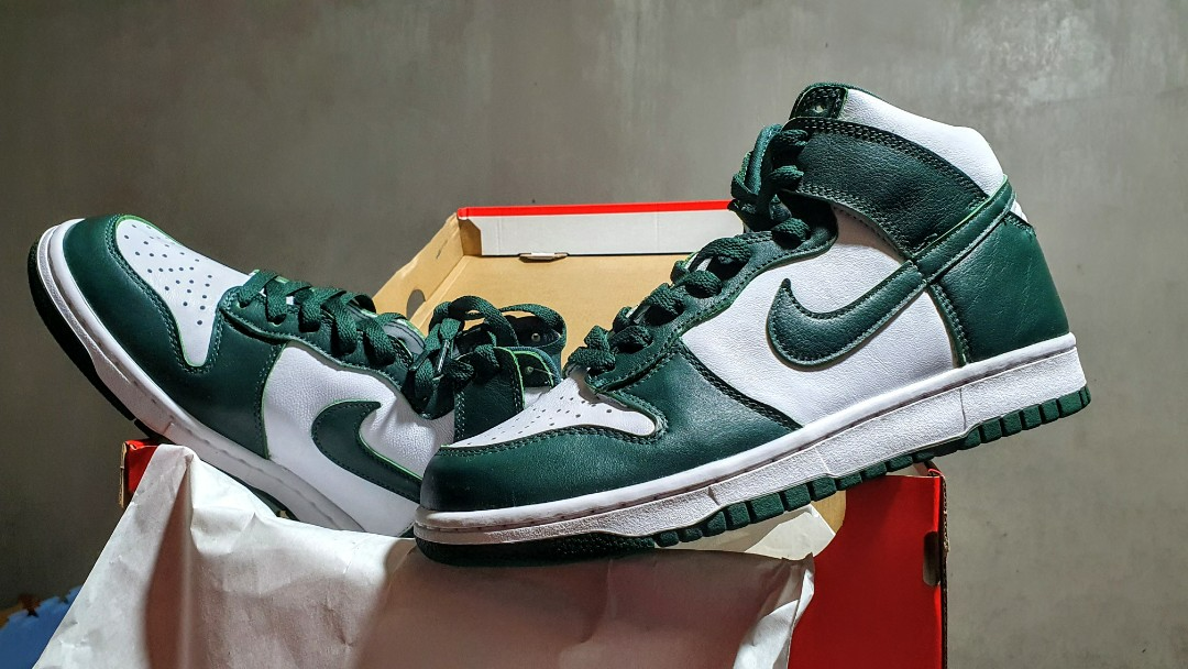 Bắt đầu cuộc sống như một đôi giày thể thao bóng rổ của trường đại học, không có gì ngạc nhiên khi Dunk High thường trông đẹp nhất khi được trang bị trong một bảng màu tổng hợp và phong cách pared-back. Được phát hành vào tháng 9 năm 2020, Spartan Green tương phản với màu trắng tinh khiết để mang đến cho phong cách này một vẻ ngoài cổ điển, mạnh mẽ.