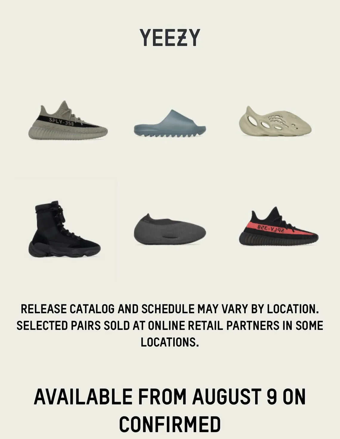 Các thiết kế phổ biến khác liên quan đến Ye sẽ được cung cấp, đánh dấu một đợt ra mắt sản phẩm ít hơn từ sự hợp tác của Ye và adidas sẽ được cung cấp. Giám đốc điều hành của adidas, Bjørn Gulden đã được ghi nhận khi nói rằng Three Stripes sẽ không bán bất kỳ chiếc Yeezy nào sau khi hàng tồn kho hiện tại của họ đã được bán hết. Ban lãnh đạo trước đây đã bày tỏ rằng họ có tất cả quyền hợp pháp để bán các phong cách như Yeezy Boost 350 v2 vì adidas sở hữu bằng sáng chế thiết kế, nhưng Gulden muốn tập trung vào việc kinh doanh “không có Yeezy”.