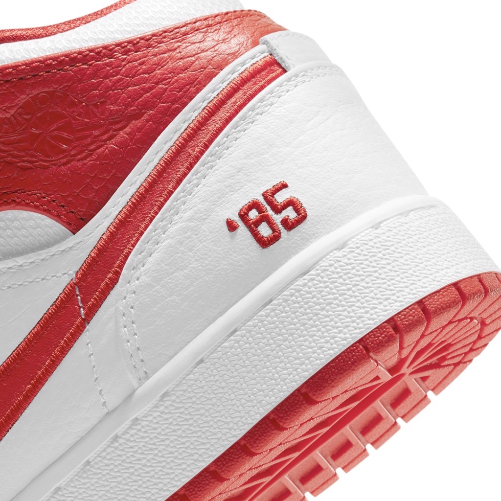 Ở bên trái, màu đỏ tươi chạm vào nắp mắt cá chân, Swoosh, đế mang màu sắc đặc trưng của chúng và được đánh bóng trên từng chiếc. Các hình thêu làm nổi bật cạnh bên, khớp với chủ đề “85” bên dưới, trong khi thương hiệu ở những nơi khác được giữ tinh tế về mặt hình ảnh.