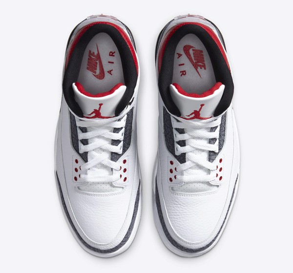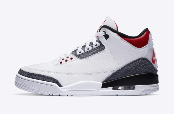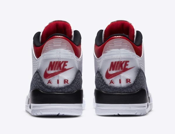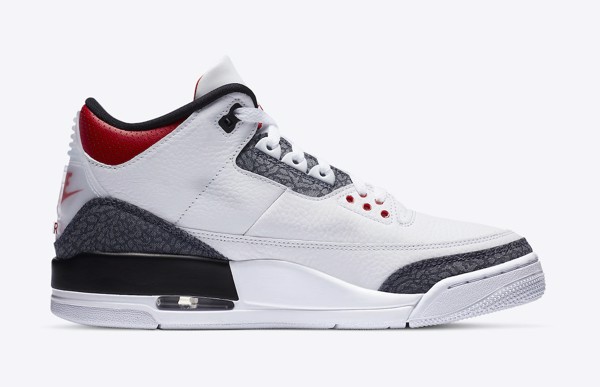 Không còn mang vẻ ngoài với màu đỏ chủ đạo như các phối màu “Fire Red” trước đây, lần này “lửa” của đôi Air Jordan 3 chỉ xuất hiện ở phần mắt cá. Màu chủ đạo trở thành màu trắng với họa tiết da voi bằng chất liệu Denim. Phần gót là logo giống với những phiên bản Japan đã được ra mắt.