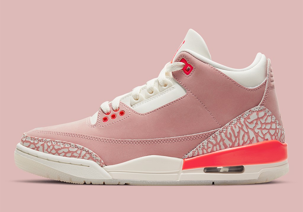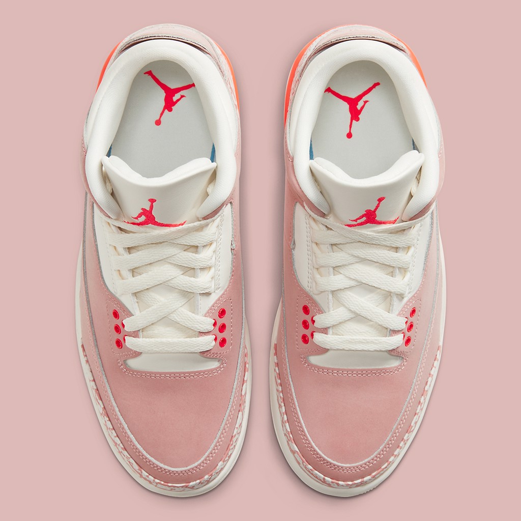 Đúng như tên gọi của nó, đôi giày lấy màu chủ đạo là một màu hồng không quá gắt, mà rất nhẹ nhàng bắt mắt. Ở trên, phần upper ngoài mang một tông màu hồng mới, thì thiết kế này vẫn mang lại các chi tiết đặc trưng riêng của dòng Jordan 3. Ví dụ, mũi giày và góc giữa của gót phủ sang hai bên vẫn được đánh dấu điểm nhấn bằng họa tiết da voi mang tính biểu tượng riêng biệt của dòng không lẫn đi đâu được, mặc dù ở phiên bản “Rust Pink” này đây nó đã được lọc qua các sắc thái của màu xám nhạt và những đường kẻ màu hồng theo chủ đề.