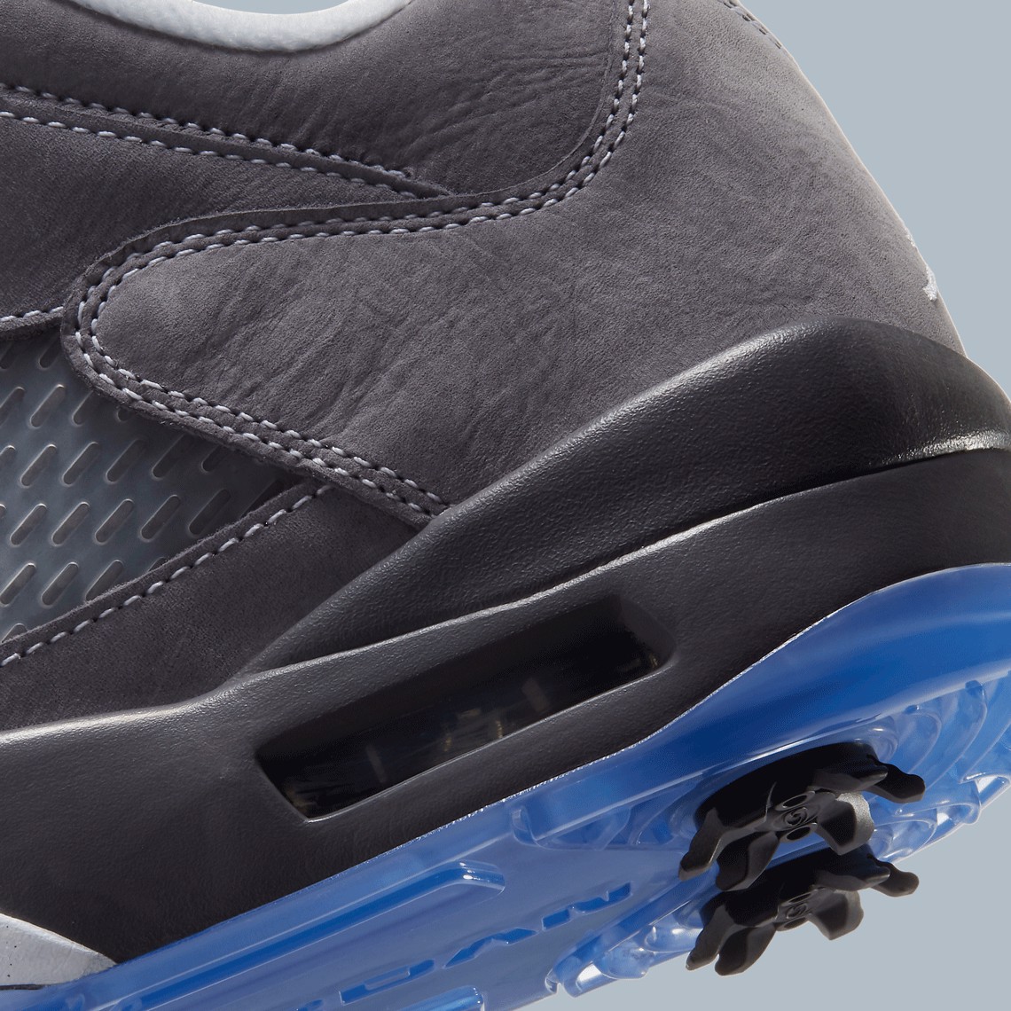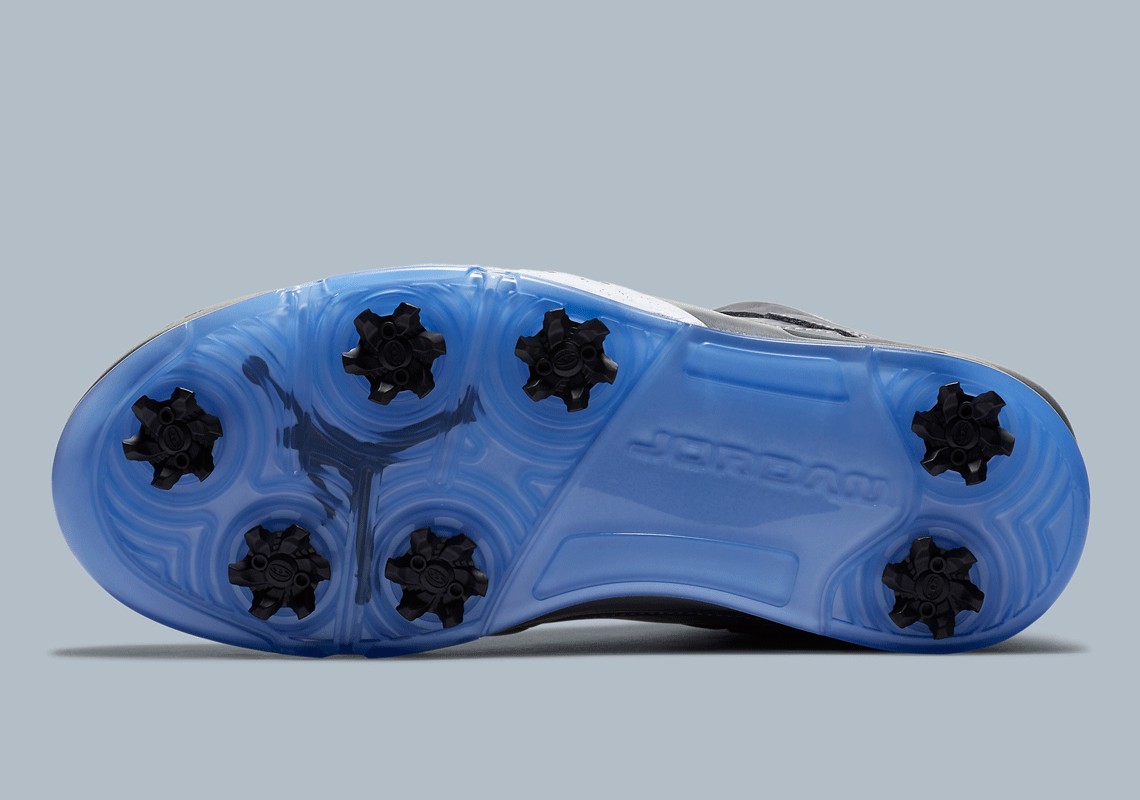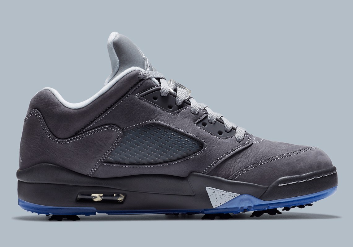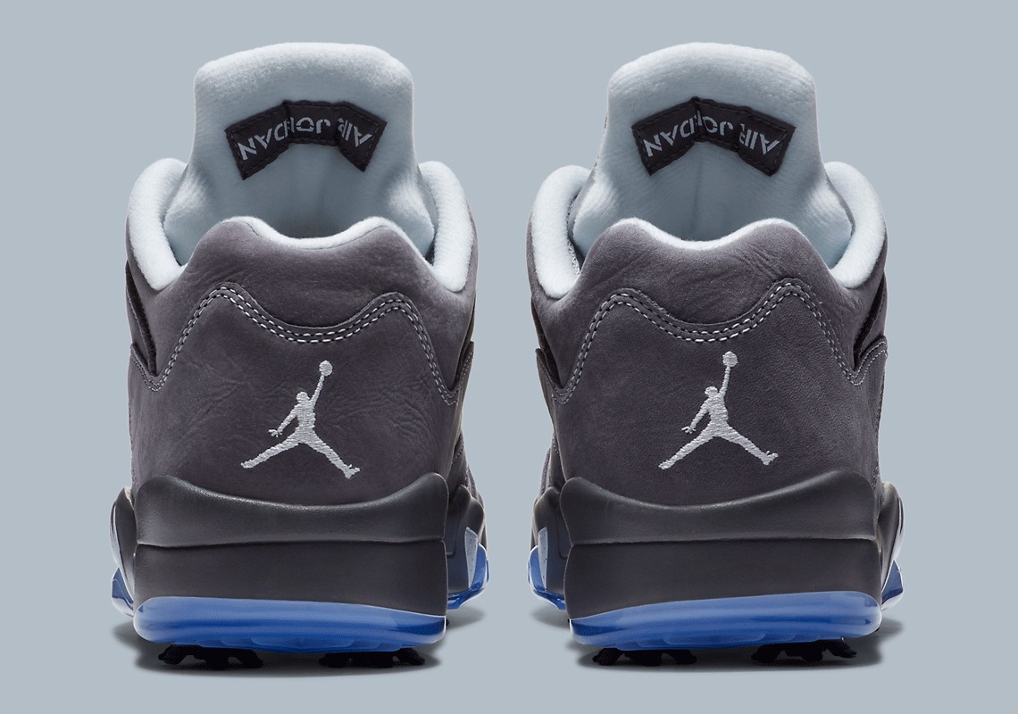 Dưới chân, Jordan 5 Low Golf bổ sung cho đế giữa hai tông màu của nó với đế ngoài màu xanh lam mờ được trang bị sự ổn định và lực kéo cho 18 lỗ.