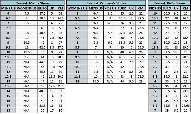 Hiện nay có rất nhiều người lựa chọn cách mua giày online để tiết kiệm được thời gian và chi phí. Tuy nhiên, cách mua hàng này cũng có nhiều nhược điểm bởi có nhiều người không nắm được các số size giày dẫn đến lựa chọn những đôi có size giày rộng hơn hoặc nhỏ hơn. Dưới đây là các bảng size giày của Reebok bạn nên tham khảo: