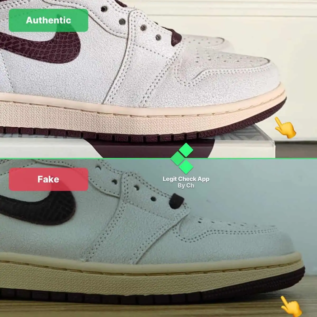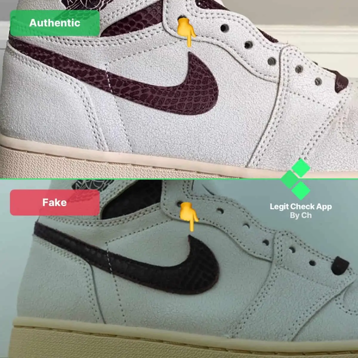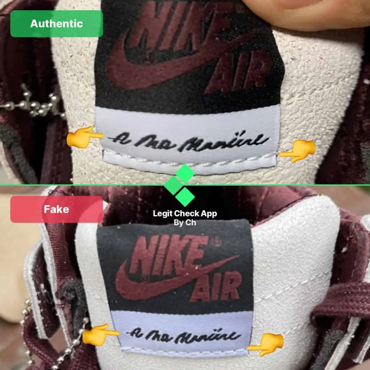 Trong hình ảnh của Air Jordan 1 giả và thật ở trên, chúng tôi đã nhấn mạnh cách đôi giả có dấu Swoosh được dán vào da không đúng cách. Chính xác hơn là Swoosh của Nike thoát ra từ những đôi giày fake. Những chiếc A Ma Maniere 1 thật có dấu Swoosh được gắn chính xác vào da, vì nó được dán hoàn toàn và không bị lòi ra ngoài, không giống như logo của đôi giả.