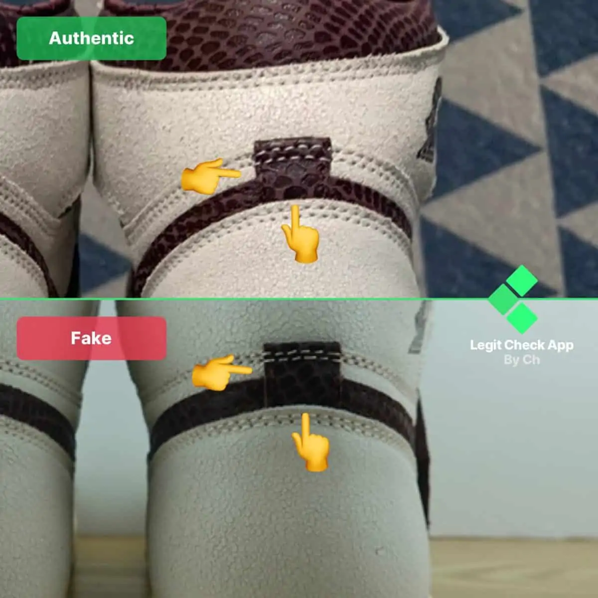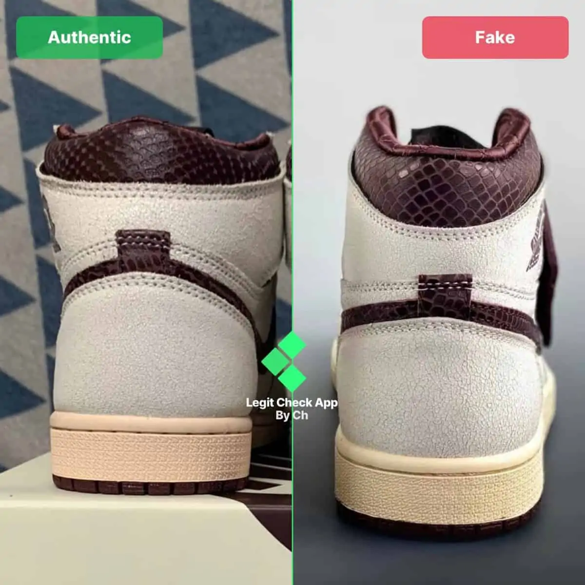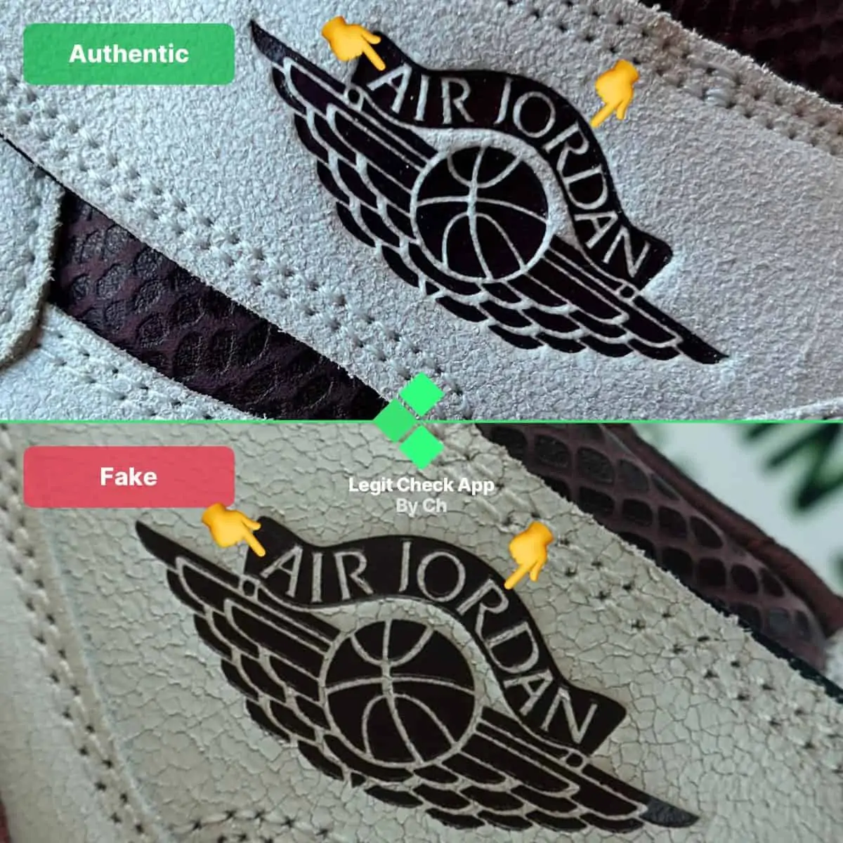 Trong hình ảnh của Air Jordan 1 giả và thật ở trên, chúng tôi đã nhấn mạnh cách đôi giả có dấu Swoosh được dán vào da không đúng cách. Chính xác hơn là Swoosh của Nike thoát ra từ những đôi giày fake. Những chiếc A Ma Maniere 1 thật có dấu Swoosh được gắn chính xác vào da, vì nó được dán hoàn toàn và không bị lòi ra ngoài, không giống như logo của đôi giả.