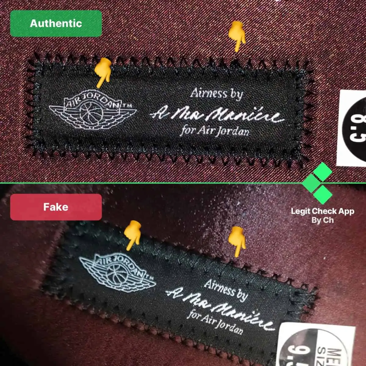 Như bạn có thể biết, những đôi A Ma Maniere 1 có đế đặc biệt, thay vì đế “Nike AIR” cổ điển trên đường phối màu thông thường của những đôi Jordan 1. Đó là một trong những khía cạnh khiến A Ma Maniere 1 trở nên đặc biệt!  “Vậy thì, chính xác điều gì đang xảy ra trong hình ảnh này?” – có hai sai sót: trên văn bản và trên đường khâu. Đầu tiên, dòng chữ “AIR JORDAN TM” trên đôi A Ma Maniere 1 giả trông quá dày vì có quá nhiều mũi khâu màu trắng gắn trên nhãn màu đen.