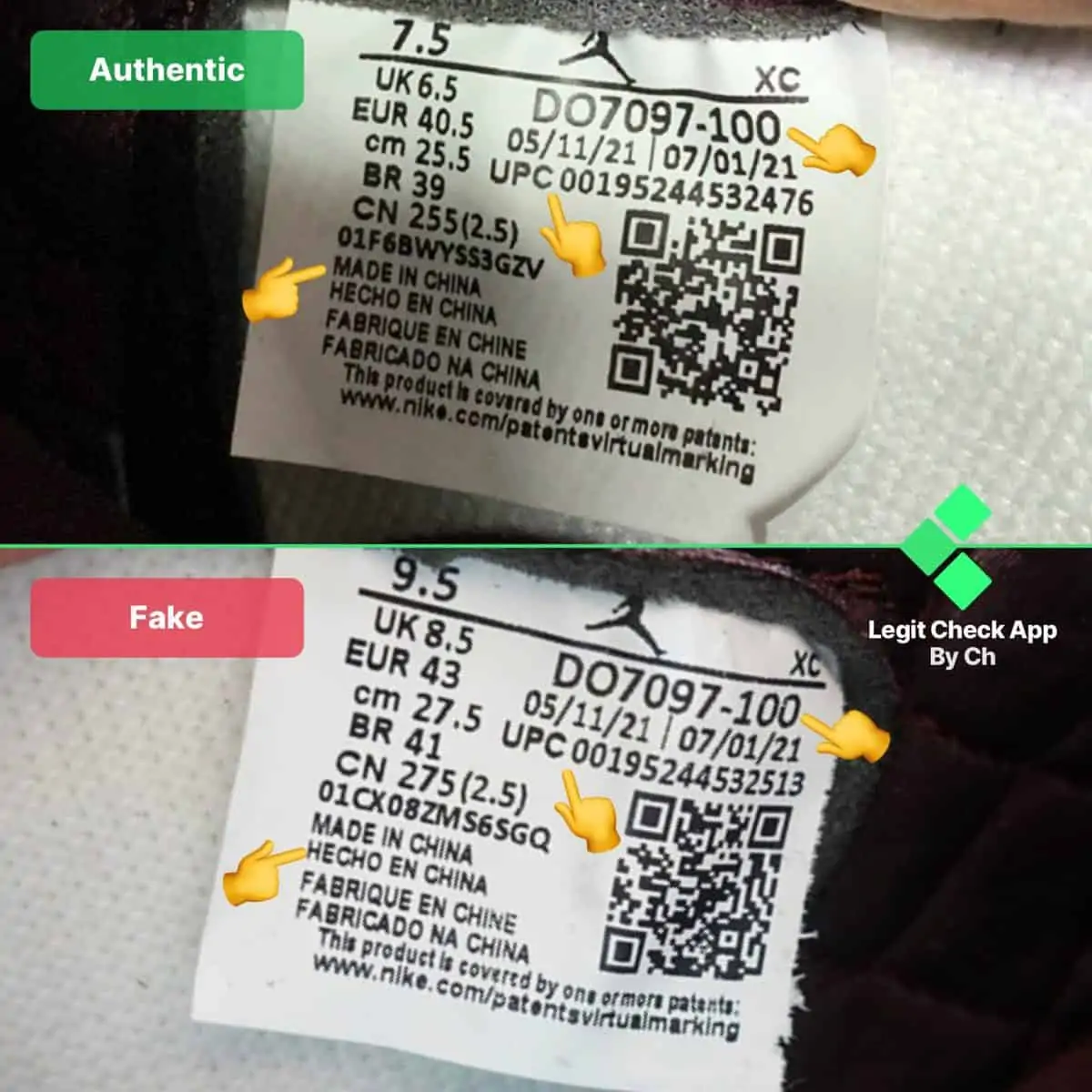 Tiếp tục, mã UPC là duy nhất cho mỗi đôi Jordan 1 chính hãng. Mặc dù vậy, tất cả các đôi A Ma Maniere 1 sẽ bắt đầu giống như vậy với “UPC 00195” – phần còn lại rất có thể sẽ khác nhau trên mỗi đôi. Bây giờ, dòng chữ “UPC” của đôi giả trông quá dày – điều này có thể dễ dàng nhìn thấy nhất nếu bạn nhìn vào các chữ cái “P” và “C”. Mặt khác, dòng chữ “UPC” của đôi real trông mỏng hơn. Hơn nữa, tất cả các chữ cái đều có cùng độ dày phông chữ, không giống như phần chữ của đôi giả.