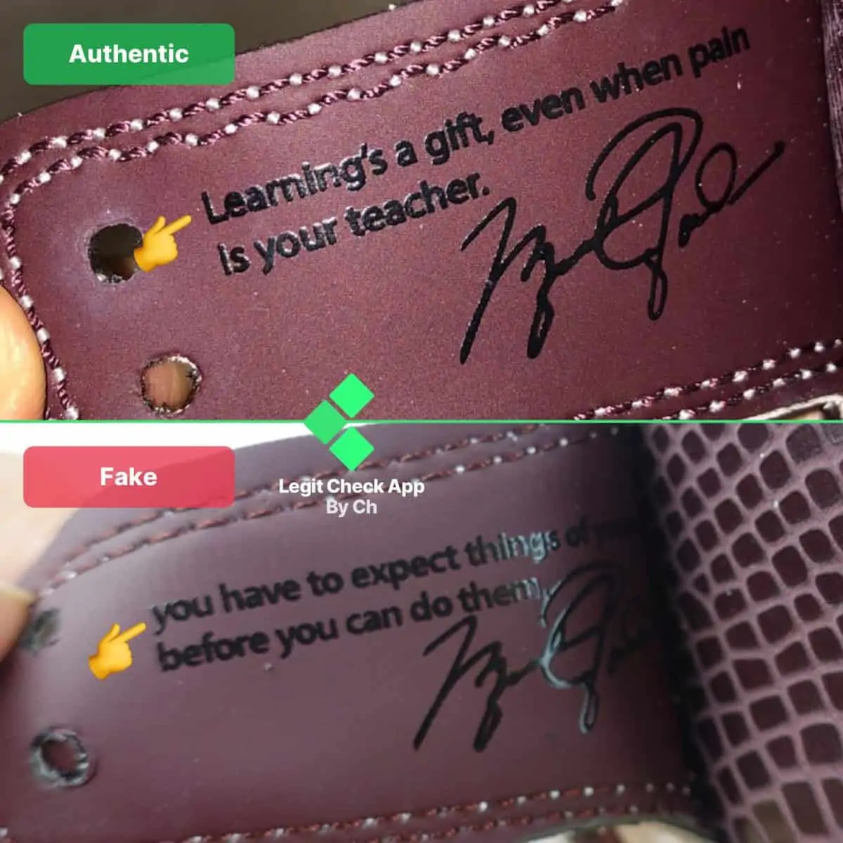 Nhìn vào đôi giày giả, bạn có thể thấy những đôi A Ma Maniere 1 nhái có dòng chữ “A Ma Maniere” trông quá dày, trong khi đôi giày thật có dòng chữ mỏng hơn. Trong cùng một nhãn, bạn cũng có thể nhận thấy đường khâu màu trắng quá mỏng và đường chỉ quá dài trên giày giả, trong khi đường khâu của nhãn thật dày hơn và nhỏ hơn, do đó trông vuông vắn hơn.
