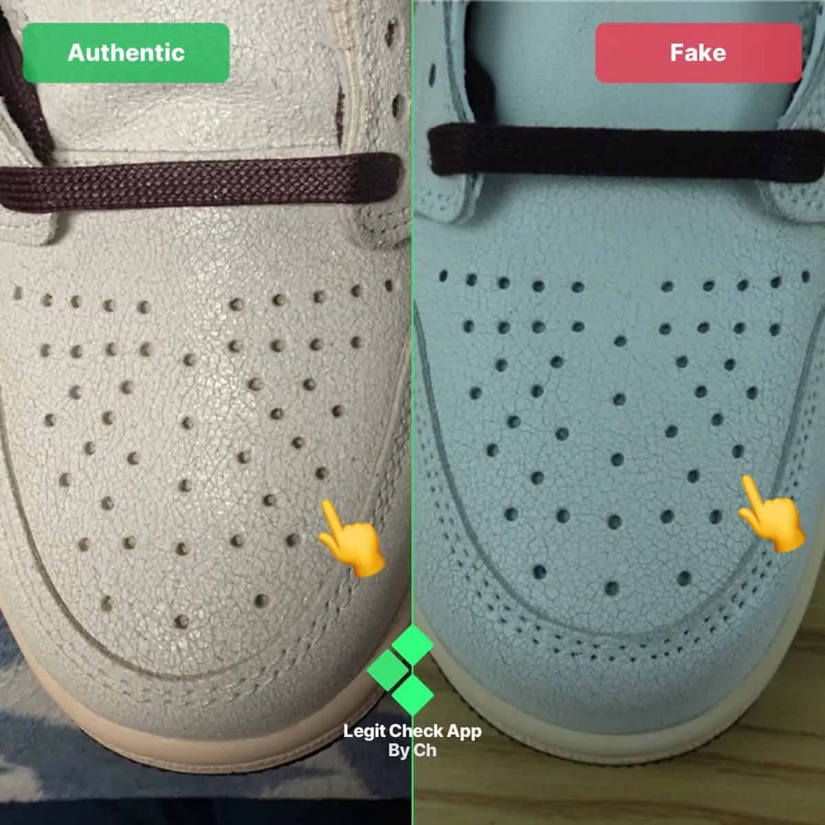Như bạn có thể thấy, những đôi giày giả có lỗ ở hộp ngón chân trông quá rộng – đó là do chúng được xỏ quá sâu vào bên trong giày. Mặt khác, Air Jordan 1 A Ma Maneires chính hãng có các lỗ ở toe box trông hẹp hơn và thường mỏng hơn các lỗ của đôi giả.
