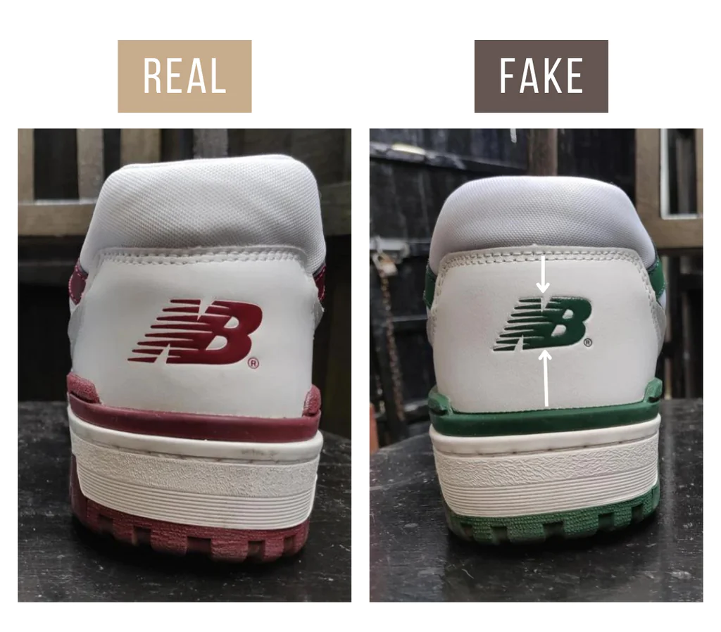 Logo New Balance ‘NB’ xuất hiện ở gót giày New Balance 550. Trên giày thật, ‘NB’ được đặt chính giữa với khoảng trắng đều xung quanh logo. Những chiếc New Balance 550 giả thường có logo gót quá cao. Kích thước của các chữ cái thực sự khác nhau, ngay cả giữa các đôi giày chính hãng, dựa trên màu sắc (logo ‘NB’ ở mặt sau của New Balance 550 màu đỏ và trắng thường lớn hơn phiên bản màu xanh lá cây và trắng).