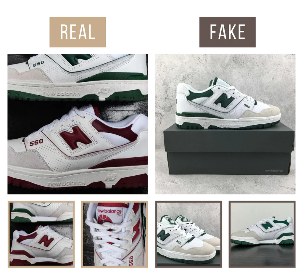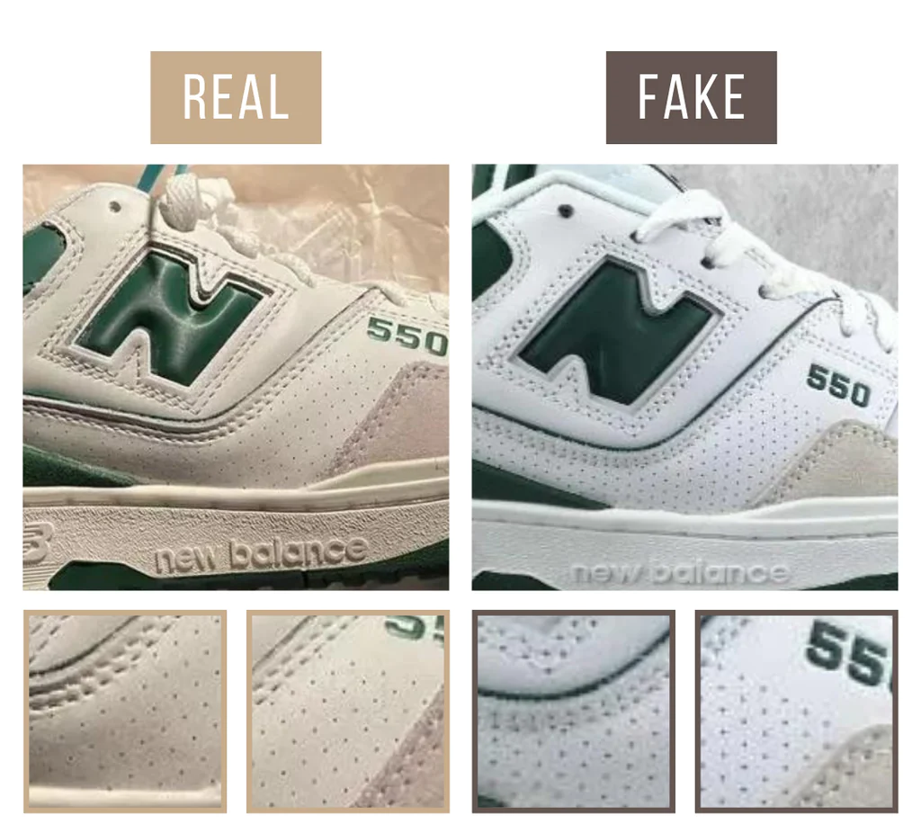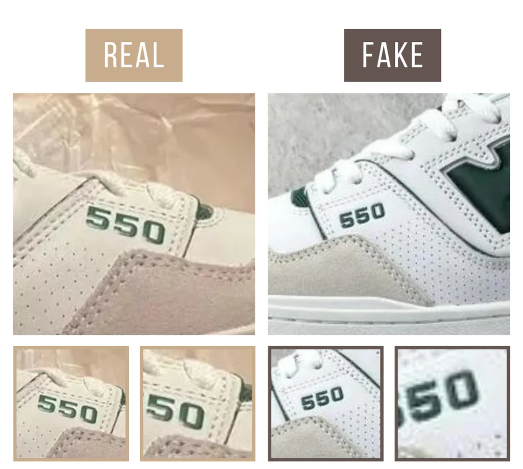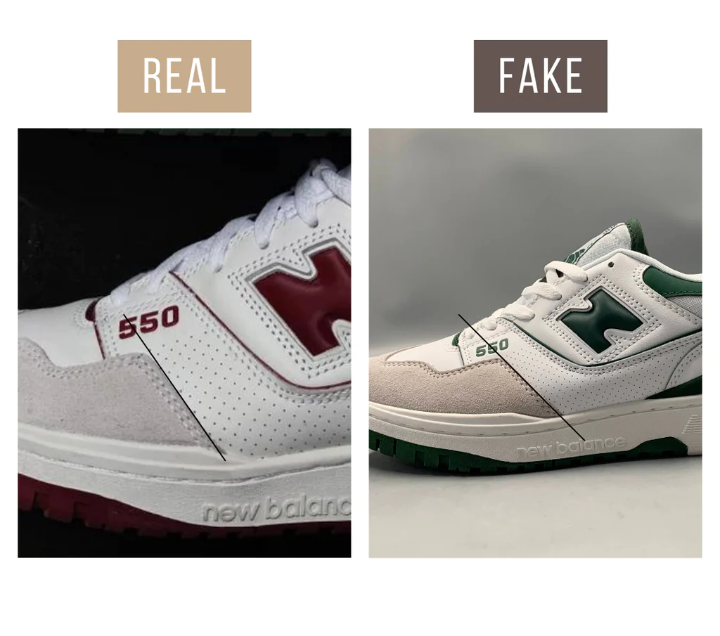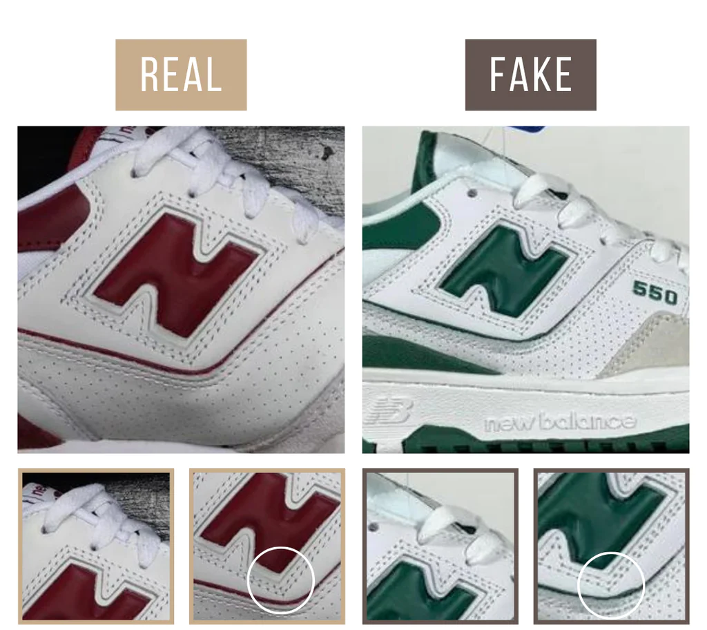 Trên một chiếc New Balance 550 chính hãng, chữ ‘N’ có hình dạng rõ ràng và có khoảng trống ở tất cả các bên. Các vết lõm ở trên và dưới được làm góc cạnh và hẹp giúp chữ rõ ràng. Hai đường khâu phác thảo chữ ‘N’ không chạm vào chi tiết bên dưới logo. Một dấu hiệu phổ biến đối với những chiếc New Balance 550 giả là nếu chữ ‘N’ quá lớn, chiếm nhiều không gian hơn trên mặt bên với đường khâu biến mất bên dưới chi tiết màu xanh lá cây ở mặt dưới. Một chiếc New Balance 550 ‘N’ giả có thể mập hoặc sủi bọt, hình dạng ít được xác định hơn tạo ra nhiều chữ ‘H’ thay vì chữ ‘N’.
