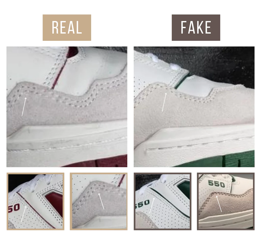 Một lỗi phổ biến, chất lượng thấp mắc phải trên những chiếc New Balance 550 nhái là khoảng cách của các đường khâu. Các tấm giày thể thao được kết nối bằng hai đường khâu cạnh nhau. Một cách để phát hiện những chiếc New Balance 550 giả là nếu các đường khâu quá gần nhau. Thay vì các đường đều, sạch, đường khâu có thể cắt nhau, uốn cong hoặc có các chỉnh sửa.