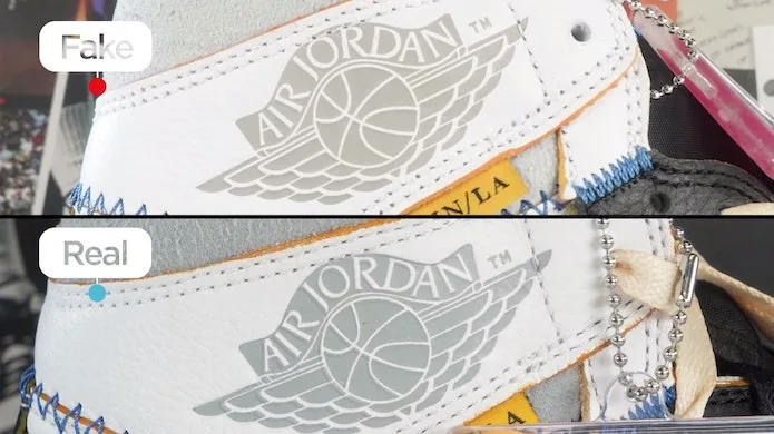 Được thiết kế bởi Peter C. Moore trên mặt sau của một chiếc khăn ăn, thiết kế Logo Wings kết hợp nhuần nhuyễn khái niệm về Michael Jordan đang bay, được đặt cho biệt danh “air” của anh ấy. Là một trong những phần quan trọng nhất của Air Jordan 1, Logo đôi cánh là một trong những khu vực quan trọng cần kiểm tra. Trên đôi giày Union Jordans giả đặc biệt này, biểu tượng đôi cánh bị lệch. Bạn có thể thấy trong hình ảnh bên dưới rằng tỷ lệ đơn giản là không đúng.