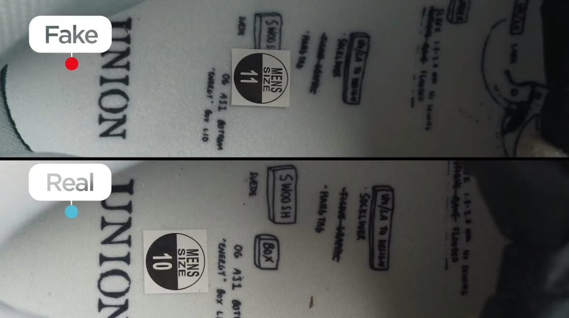 Phông chữ cũng rất rõ ràng và bắt đầu ngay sau phần đầu của bọt trên lưỡi, giống như mọi chiếc Jordan 1. Tuy nhiên, khi nhìn vào những chiếc Union 1 giả, sự khác biệt rất rõ ràng. Bạn có thể thấy rằng văn bản trên thẻ lưỡi bắt đầu quá sớm, chạm tới bọt và làm vỡ bọt. Chữ trên Jordan 1 Unions giả rất mờ và không dễ đọc. Thêm vào đó, màu thẻ lưỡi quá tối. Mặc dù đây có thể là những chi tiết nhỏ đối với một số người, nhưng chúng tạo ra sự khác biệt rất lớn trong việc xác định tính xác thực.
