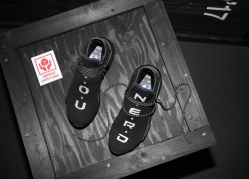 Phiên bản đầu tiên của dòng giày hợp tác giữa Pharrell Williams và adidas lần đầu xuất hiện vào tháng 7/2016 dưới cái tên NMD Human Race. Với vẻ ngoài futuristic đầy ấn tượng đi kèm hệ thống dây độc đáo, đôi giày nhanh chóng thu hút sự chú ý của người hâm mộ và nhanh chóng sold out trong nháy mắt. Phần upper được làm từ chất liệu Primeknit nổi tiếng, đi kèm dòng chữ Hu đặt trên phần mũi giày, kết hợp một cách độc đáo với bộ đệm Boost cùng phần khung TPU chắc chắn. Chàng ca sĩ 10 lần giành giải Grammy đã từng giải thích rằng: ” Hu là từ viết tắt cho Human (Con người) và nhân loại. Tuy nhiên, Hu cũng là một từ liên quan đến màu sắc. Tuy chúng ta khác nhau về màu da, ngôn ngữ nhưng chúng ta đều kết nối với nhau.”