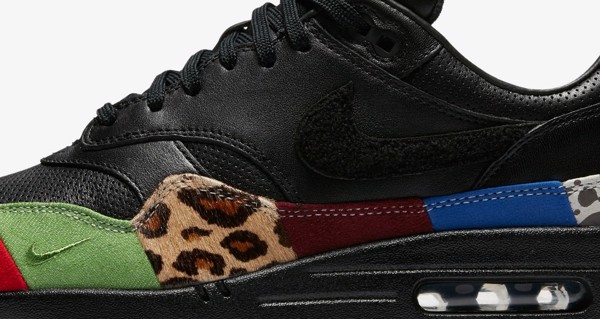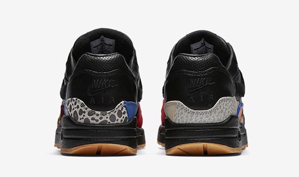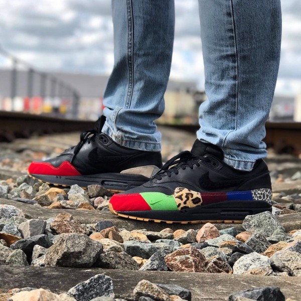 Chiếc Air Max 1 “Master” được bọc trong lớp da cao cấp màu đen trên upper với đế chắn bùn nhiều màu có cả OG Red, họa tiết animal Atmos, OG Blue và dấu ấn Patta’s Chlorophyll. Nike “Swoosh” đen, đệm Air màu đen và đế màu Gum.