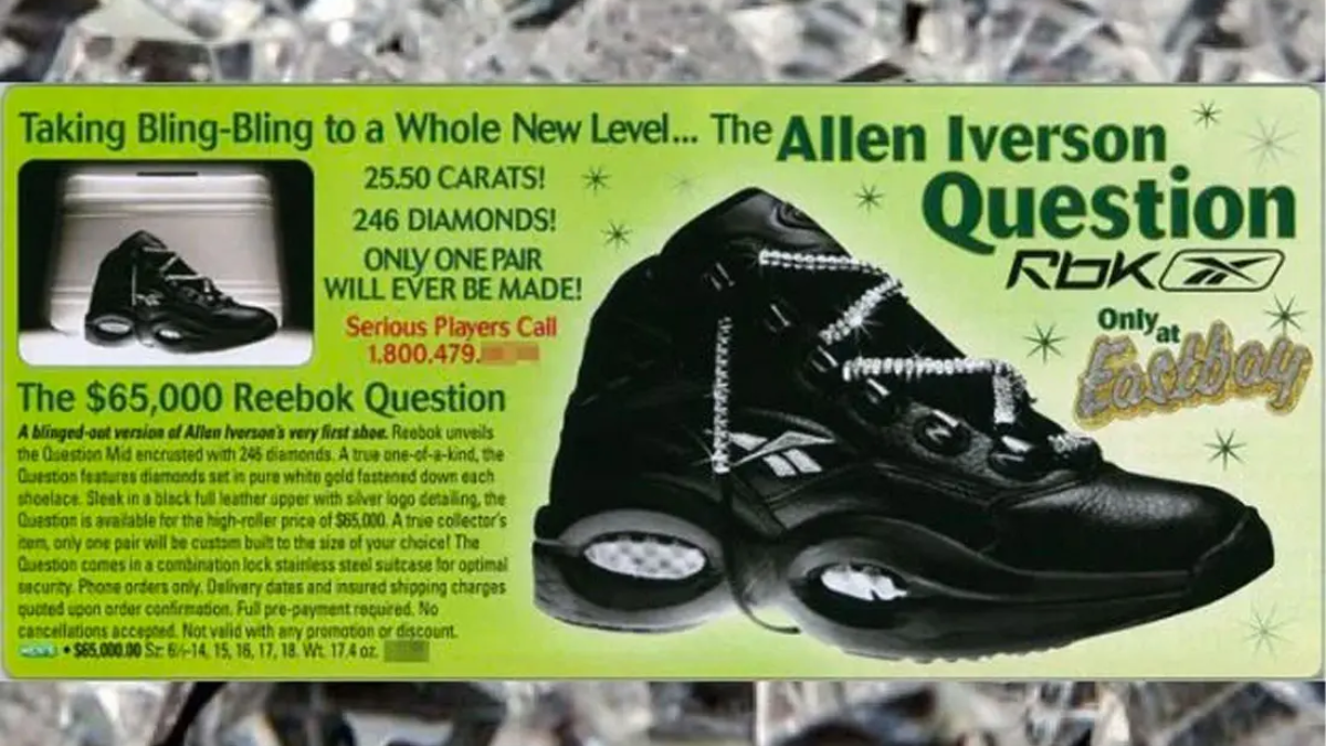 Reebok hiện đang tiếp tục kỷ niệm 25 năm mẫu giày thể thao Question huyền thoại của Allen Iverson, đôi giày dường như đã đạt đến một đỉnh cao khác về mức độ phổ biến và doanh số bán hàng. Tuy nhiên, trở lại năm 2004, dòng AI3 bắt đầu suy yếu dần, vậy ‘Bok đã làm gì? Họ nạm một đôi Question với 246 viên kim cương – tất nhiên là tổng cộng 25,50 carat. Ai thực sự đã bỏ ra 65.000 USD RRP cho đôi này? Chỉ Eastbay mới biết sau khi hợp tác với Reebok cho dự án hoành tráng này.