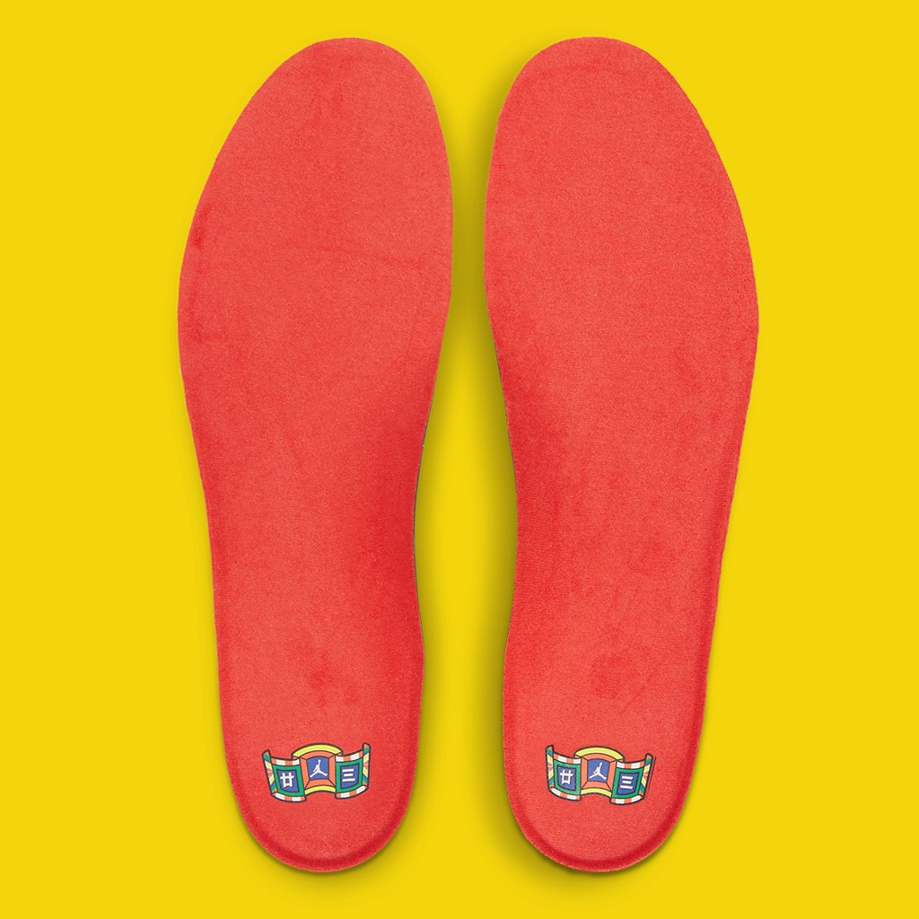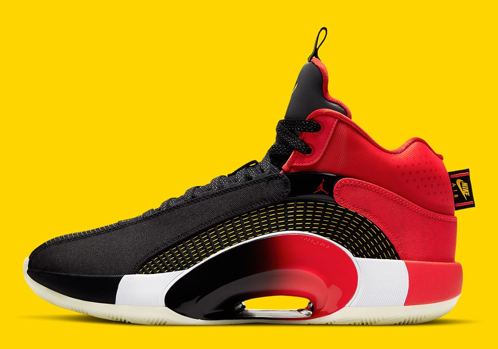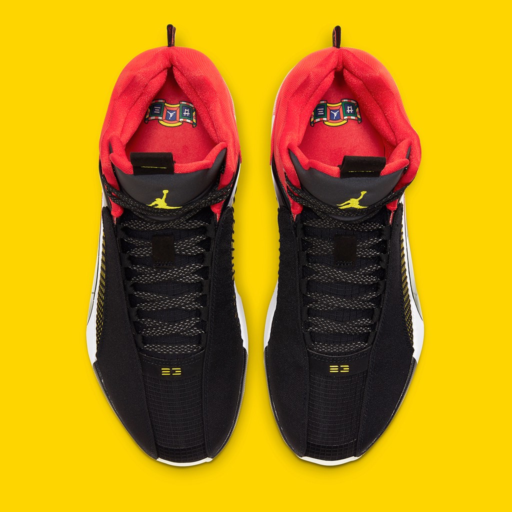Màu vàng được hiện diện duy nhất trên số 23 được cách điệu hóa bởi các dòng kể ngang trên mũi cũng như biểu tượng Jumpman chính giữa chiếc lưỡi gà “siêu to khổng lồ” đặc trung của dòng Jordan 35 này. Những chi tiết thiết kế mang đậm phong cách Chinese new year nhất có thể kế để còn là miếng tag bằng vải ở sau gót với hai chữ trung quốc giống như một lá cờ lễ hội. Ngoài ra trên miếng lót cũng được in một tấm biển treo vào những ngày lễ tết với biểu tượng jumpman trên đó. Đôi giày hoàn thiệt với chiếc dây phan quang.
