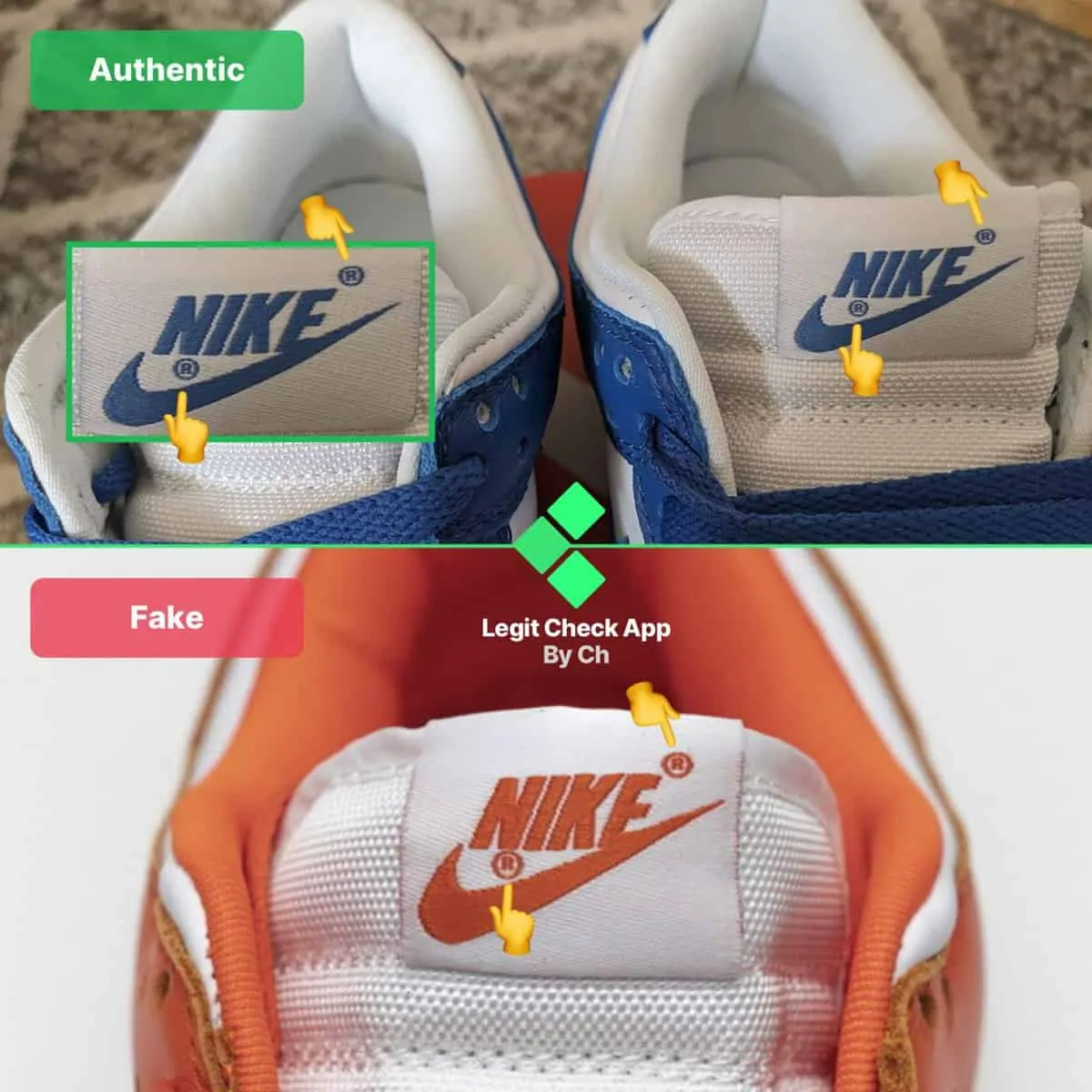 Đối với bước cuối cùng trong hướng dẫn này về cách phát hiện giày thể thao Nike Dunk Low giả, chúng tôi sẽ kiểm tra giày thể thao Nike Dunk giả và thật qua logo trên lưỡi gà . Trước hết, chúng ta hãy xem nhanh hình ảnh tham khảo của Nike Dunk thật và giả để dễ dàng hiểu được những sai sót trên giày Dunks giả. Trong hình ảnh Nike Dunk Low thật và giả ở trên, chúng tôi đã chỉ ra cách đôi giày thể thao Nike Dunk nhái có nhãn hiệu đã đăng ký “®” của họ hai biểu tượng trông quá dày so với các biểu tượng gặp trên giày thật. Nhìn vào giày Nike Dunk chính hãng, bạn có thể dễ dàng nhận thấy cả hai ký hiệu “®” đều mỏng hơn ký hiệu gặp trên giày giả. Và trên là những tip nhỏ để bạn có thể biết check một đôi Dunk Low mà không bị dính fake. Và đừng quên cập nhật những thông tin mới nhất đến từ Authentic Shoes nha.