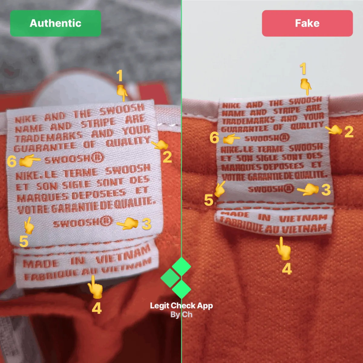 Tiếp theo, bạn phải check biểu tượng nhãn hiệu đã đăng ký bản quyền “®”. Trên giày Nike Dunk giả, bạn có thể dễ dàng nhận thấy ký tự “®” quá dày và quá rộng so với giày thật. Sau đó, chuyển đến dòng chữ “FABRIQUE AU VIET NAM” ở phía dưới cùng bạn có thể nhận thấy dòng chữ Dunks giả trông quá lớn vì nó bị kéo dài ra. Con trỏ biểu tượng cảm xúc bằng tay thứ năm trong hình ảnh Nike Dunk Low giả và thật ở trên cho bạn thấy dòng chữ “VOTRE” trên giày thể thao Nike Dunk nhái quá dày so với dòng chữ của giày chính hãng. Cuối cùng, con trỏ biểu tượng cảm xúc ở bàn tay thứ sáu cho bạn biết cách dòng chữ “SWOOSH” giả của Nike Dunk ở giữa nhãn được thêu mờ không rõ nét .