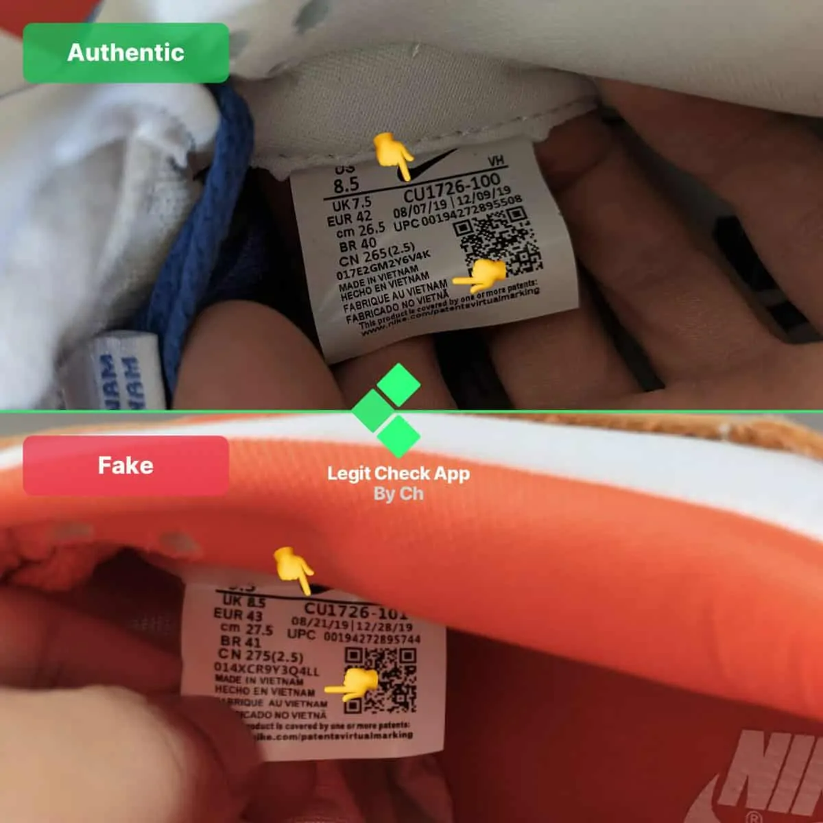 Tiếp tục, đối với bước thứ tư trong hướng dẫn cách phát hiện giày fake, chúng ta sẽ kiểm tra giày thể thao Nike Dunk thật và giả qua con tem bên trong giày. Trong hình ảnh Nike Dunk fake và real ở trên, các bạn có thể thấy trước hết, Dunks giả có dòng chữ “CU1726-100” ở góc trên bên phải của thẻ kích thước dày nét chữ không sắc lắm và không mềm mại. Sau đó, bạn có thể thấy dòng chữ “MADE IN VIETNAM” ở phía giữa của tem quá dày trên đôi Dunk giả, còn trên đôi thật thì mỏng hơn.