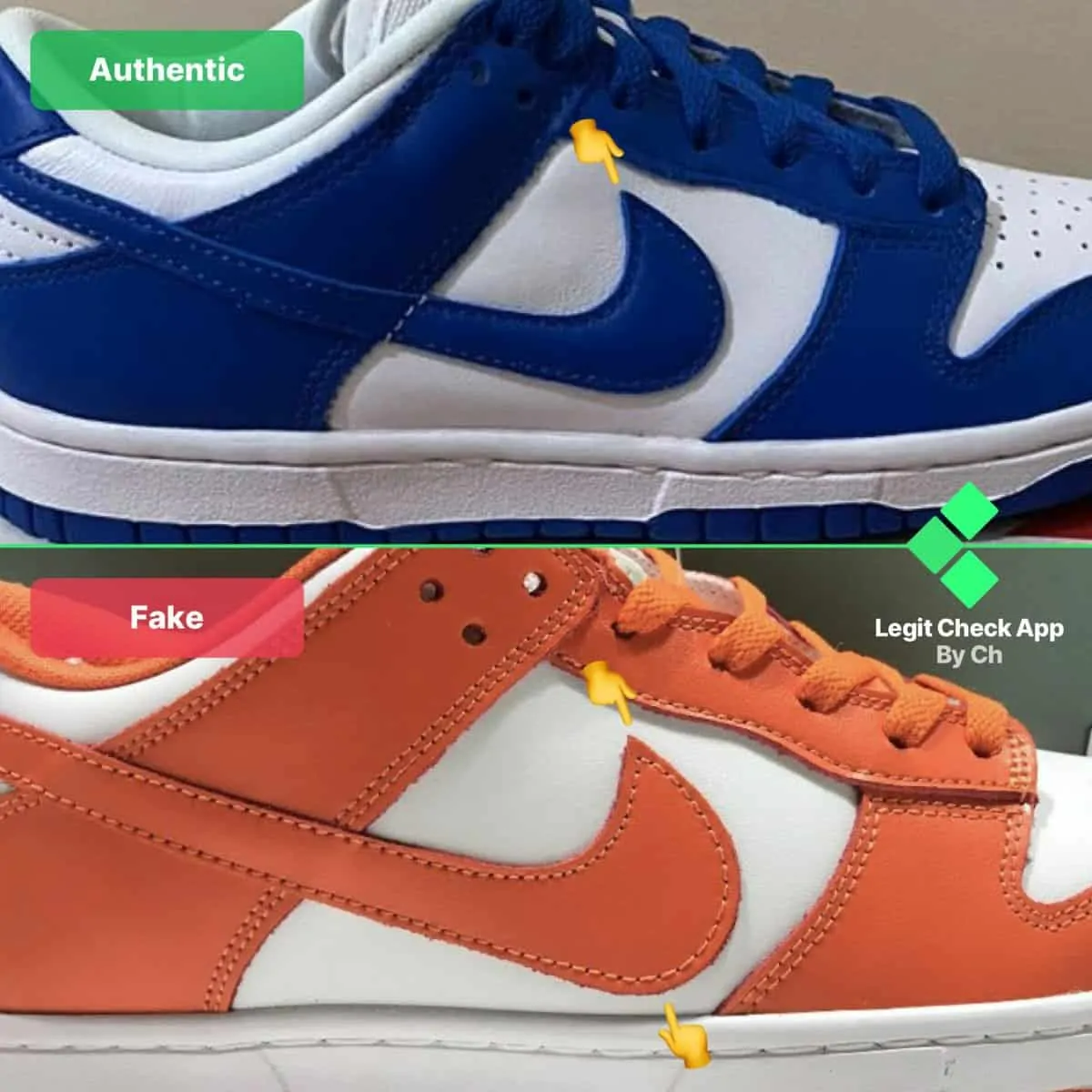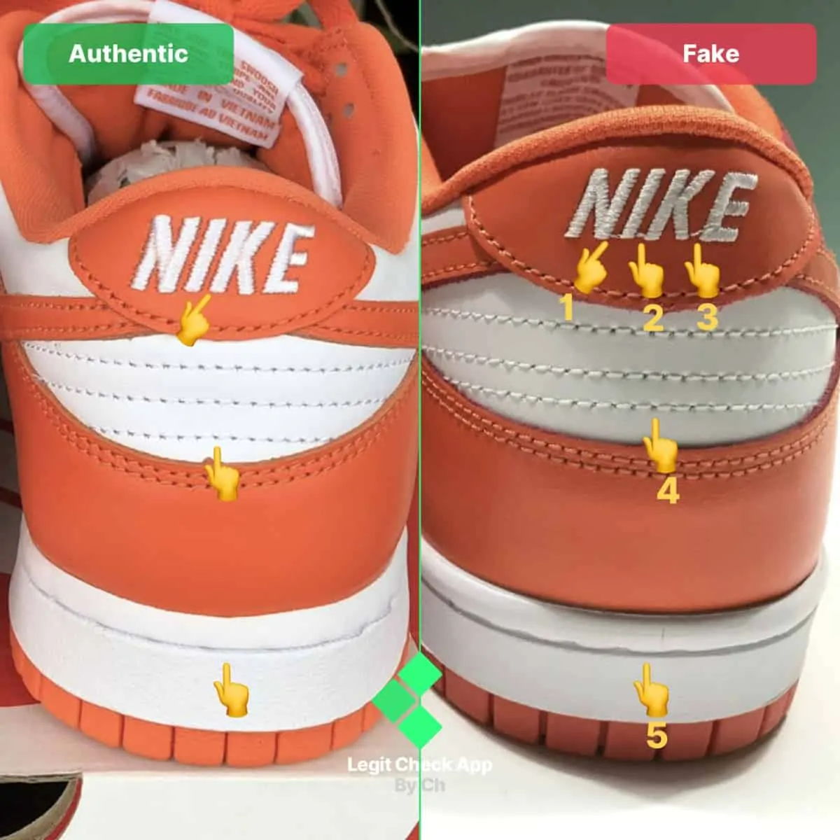 Đối với bước thứ hai trong hướng dẫn check giày thể thao Nike Dunk này, chúng ta sẽ kiểm tra giày Nike Dunk thật và giả để biết các chi tiết ở phần gót. Trong hình ảnh Nike Dunk giả và thật ở trên, chúng tôi đã chỉ ra 5 lỗi chính trên Dunk giả. Biểu tượng cảm xúc bàn tay 1, 2 và 3 cho bạn thấy dòng chữ “NIKE” của giày thể thao Nike Dunk fake ở đầu quá mỏng và không chỉ vậy, nó còn có thêm các sợi chỉ nối mỗi chữ cái trên các dòng chữ. Mặt khác, giày thể thao Nike Dunk Low chính hãng sẽ không bao giờ dòng chữ có thẻ được kết nối với nhau, vì mỗi chữ cái là độc lập. Con trỏ thứ tư trong hình ảnh Nike Dunk ở trên cho bạn thấy đường khâu chéo ở mặt giữa của giày giả quá dày và quá nhỏ so với đường khâu gặp trên giày Dunks chính hãng.