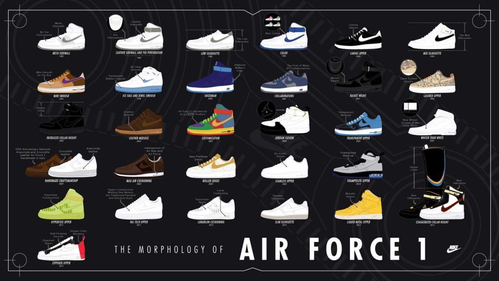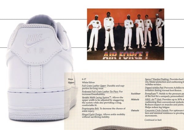 Năm 1982, nhà thiết kế Nike Bruce Kilgore đã giới thiệu Air Force 1 là đôi giày bóng rổ tốt nhất sau Blazer và nó đã ngay lập tức thành công. Mẫu giày thu hút về rất nhiều fan hâm mộ vì cấu trúc chắc chắn và là đôi giày bóng rổ đầu tiên có công nghệ đế Air Unit đặc trưng được giới thiệu bởi Tailwind. Hiệu năng của Air Force 1 là lý do chính khiến người ta ùn ùn đi mua nó, vì khi đó đôi sneaker này giúp siêu sao NBA: Moses Malone và Philadelphia 76ers dành danh hiệu NBA đầu tiên. Gắn liền với NBA All-Star, kết hợp với các công nghệ mới lạ, Air Force 1 là đôi giày thành công nhất của Nike.
