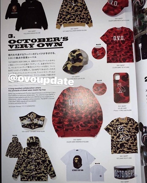Bộ sưu tập sẽ lấy họa tiết con cú của OVO làm trọng tâm, bên cạnh đó là logo BAPE đặc trung trên nền họa tiết camo xanh và đỏ. Hình ảnh được tiết lộ phía bên dưới cho biết bộ sưu tập sẽ xuất hiện vào mùa thu năm nay với mức giá cực kỳ hấp dẫn dành cho người hâm mộ.
