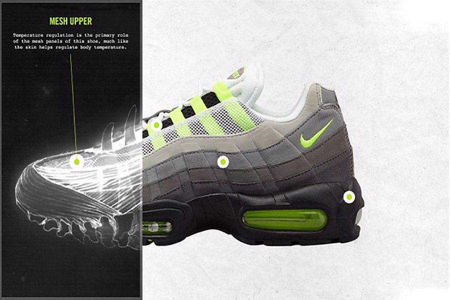 Một đôi giày thể thao của thương hiệu tinh tế và mang hình thức nổi bật. Chiếc Air Max 95 do Sergio Lozano thiết kế được tạo ra với tâm trí về giải phẫu con người (một sự thật thú vị có vẻ đồng thời rất ngầu và hơi thô thiển). Điều quan trọng cần lưu ý là Air Max 95 đánh dấu một cột mốc quan trọng trong dòng thời gian của Nike Air Max khi việc đại tu hoàn toàn về thiết kế thể hiện sự tự tin của thương hiệu trong mối quan hệ với người tiêu dùng. Và họ đã thành công hoàn toàn khi đôi giày chỉ vừa mới có những hình ảnh chính thức, thì đã thành luôn một hiện tượng toàn cầu.