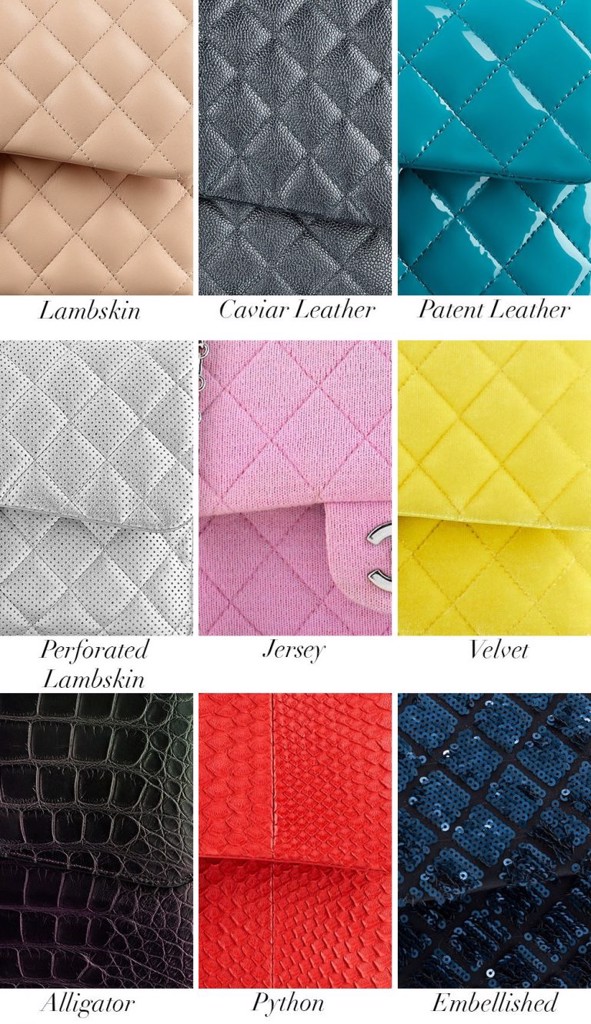 Chiếc túi được các quý cô yêu thích vì chúng được tạo nên bởi nhiều chất da. Những chất liệu và da chính yếu để tạo nên Classic Flag Bag là Lambskin (da cừu), Caviar Leather, Patent Leather, Perforated Lambskin, Jersey (vải sợi), Velvet (nhung), Alligator (da cá sấu), Python, Embellished.
