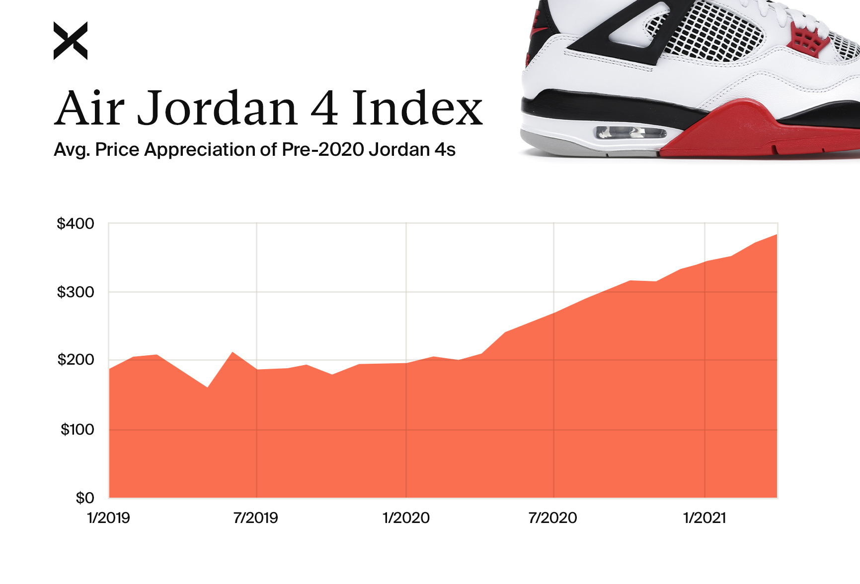 Ở cấp độ bán lẻ, Air Jordan 4 thường có giá 200 đô la ngay bây giờ, khiến chúng trở thành một trong những đôi đắt tiền hơn trong dòng Jordan. Nhưng ngay cả ở mức giá này, họ vẫn thường bán hết. Giá trị thực của Jordan 4s sau đó được để lại cho người mua và người bán trên thị trường. Trong năm qua trên StockX, Jordan 4 trung bình được giao dịch với giá 340 đô la, cao hơn 70% so với giá bán lẻ. Jordan 4s không chỉ bán ở mức phí cao. Chúng cũng tăng giá trị theo thời gian. Đối với phân tích này,