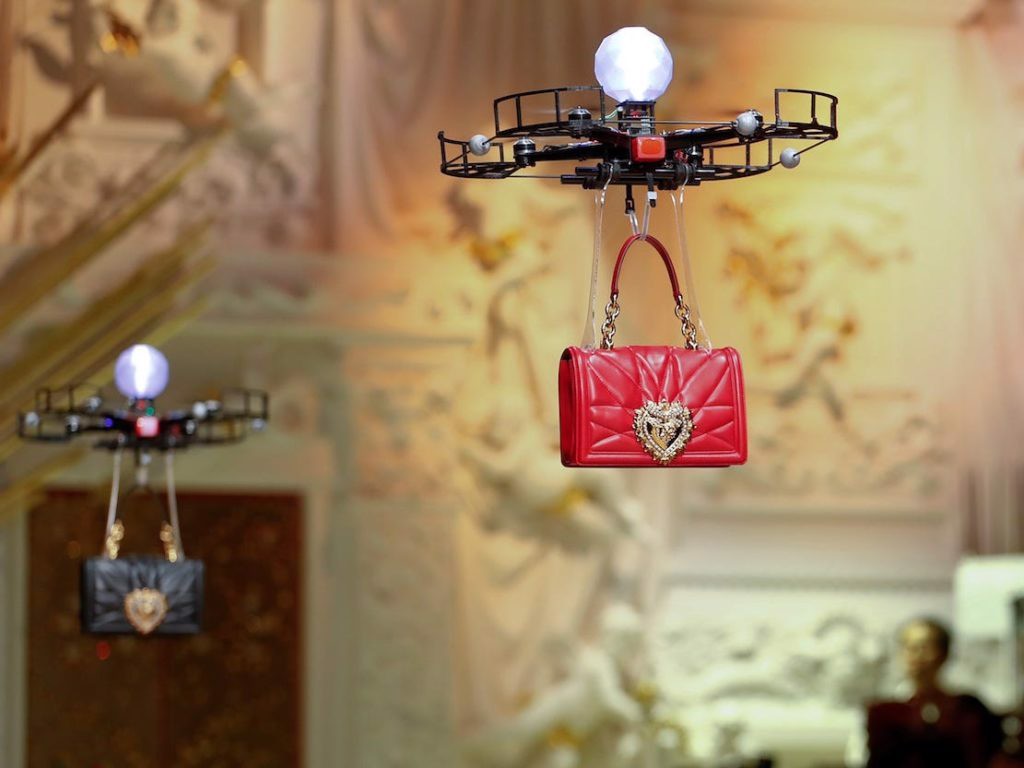 Ai cần người mẫu khi bạn có máy bay không người lái! Vào năm 2018, máy bay không người lái quadcopter mang túi xách bằng da và nạm trang sức từ bộ sưu tập Thu Đông của D&G thay vì những người mẫu sẽ xách chúng và catwalk. Để đảm bảo công nghệ hoạt động tối ưu, khán giả được yêu cầu tắt Wi-Fi trên điện thoại của họ cũng như bất kỳ điểm phát sóng cá nhân nào.