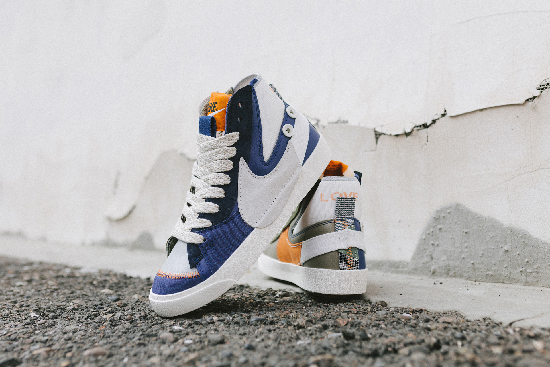 Nike Blazer Mid Jumbo Voodoo là một đôi giày độc đáo kết hợp giữa chất liệu vải bạt và da lộn với các đường khâu lộ ra ngoài. Phần má giày bên ngoài của phiên bản này sẽ được bảo phủ bởi tông màu xanh nước biển trong khi phần bên trong sẽ có tông màu xanh ô liu. Ngoài ra, điểm nhấn chủ đạo của mẫu thiết kế này sẽ nằm ở phần lưỡi xốp được in logo Nike và phần gót giày có in chữ “LOVE”. Đáng chú ý, phiên bản này cũng sẽ được đính kèm một con búp bê voodoo có thể tháo rời ở phía sau mắt cá chân và đế cao su Gum.