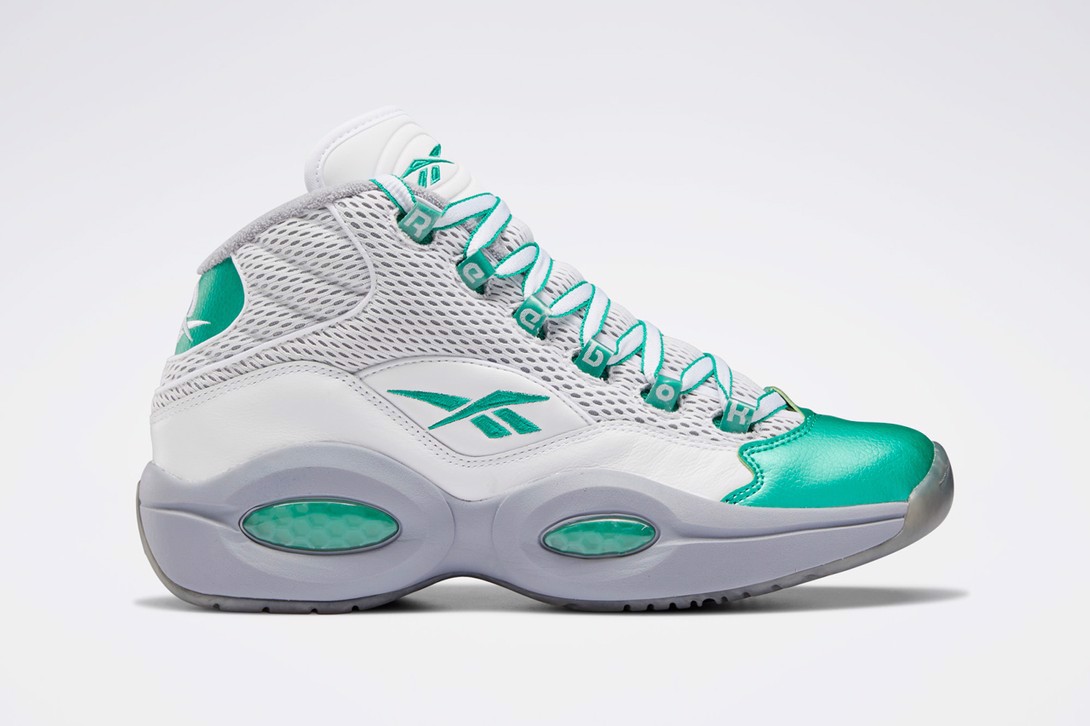Là sự thừa nhận song song về sự vĩ đại của đội bóng rổ trường trung học của Allen Iverson và đội bóng bầu dục Philadelphia Eagles, Reebok Question Mid “Court Green” dường như sẽ khiến những người hâm mộ Iggles vô cùng phấn khích sau khi Question Mid – đôi giày lấy cảm hứng từ bóng bộ môn bóng bầu dục của AI sử dụng bảng màu Cowboys cuối cùng cũng được ra đời. Cấu tạo đôi giày với màu sắc “Court Green” trên toebox đi kèm cũng bộ đệm DMX nổi tiếng của Reebok. Cuối cùng là phần upper bằng vải mesh và bộ outsole với các họa tiết vô cùng đặc sắc.