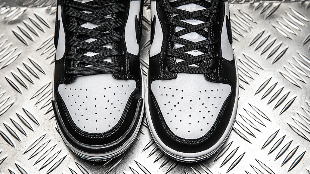 Dấu Swoosh lớn của Dunk Low Twist không phải là phần cứng duy nhất được sử dụng. Gia cố phần ngón chân và gót chân là các miếng đệm bằng nhựa cao su cứng – một lần nữa có thể được lấy cảm hứng từ chuyến khám phá trước đây của Nike – để tạo thêm độ sâu cho kết cấu. Đối với phiên bản ‘Panda’, các chi tiết này hơi trong mờ và giống như ‘thạch’ với một chút bóng, tạo điểm nhấn độc đáo trên bề mặt mờ của dấu Swoosh lớn và đồng thời bổ sung cho phần gót bóng loáng. Một lĩnh vực đáng quan tâm khác là nhãn hiệu trên lưỡi của Twist nhô ra để mạnh dạn tuyên bố nhãn hiệu Swoosh và Nike.