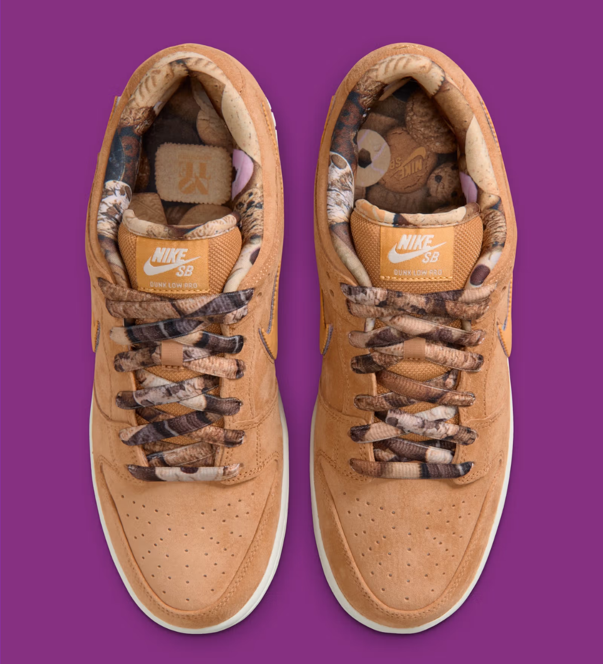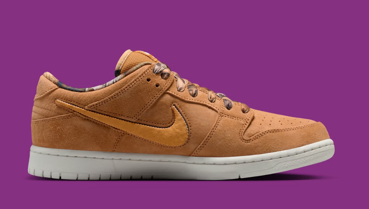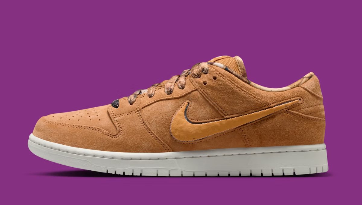 Tổng thể đôi giày sử dụng gam Flax brown chủ đạo trên upper suede, gợi nhớ màu trà sữa đậm hoặc lớp bánh nướng vàng nâu. Phần midsole trắng giúp cân bằng tổng thể, đồng thời giữ chất cổ điển vốn quen thuộc trên Dunk Low.