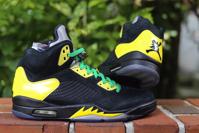 Phiên bản Air Jordan 5 đầu tiên trong bộ collab lần này được thiết kế để trao tặng cho đội bóng rổ của Oregon. Phối màu lần này được tô chủ yếu là màu đen kèm theo màu vàng tô đậm lên những chi tiết của đôi giày. Phần da được lựa chọn để tạo nên đôi giày này là Suede leather. Ngoài ra nó còn được đi kèm với 2 bộ dây màu đen và xanh lục cho các bạn thay đổi. Bên cạnh đó là những detail “Duckman” đặc biệt như phiên bản 4s Duckman ở phần Heeltbabs. Và cũng không thể không nhắc đến chi tiết “Cũ nhưng lạ” là logo “O” truyền thống của Oregon ở phần lưỡi gà. Tuy nhiên thì chính giữa những logo này, Hatfield đã đánh dấu thêm những chữ số áo của các cầu thủ và in tên của họ vào mặt inner của lưỡi gà (lý do là vì MJ muốn chấm dứt tình trạng resell và tuồn những đôi giày PE ra ngoài). Chính vì chi tiết đặc biệt này nên giá resell của đôi 5s này không hề dễ chịu tí nào, $8000 là số tiền trung bình bạn phải bỏ ra để đưa đôi giày này về nhà bạn.