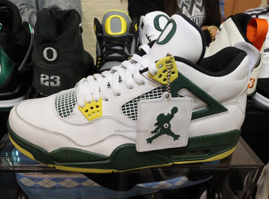 Phiên bản 4s tiếp theo trong bộ collection của Nike và Oregon được thiết kế đặc biệt lấy cảm hứng từ linh vật của Oregon, Puddles the Duck. Đôi giày này được design rất rất đặc biệt khi thay đổi hoàn toàn từ logo Jumpman sang logo Duckman. Phần lưỡi gà của đôi giày này có logo “O” như những phiên bản trước. Bộ tông màu được chọn lần này là White, Dark Green và Yellow (Những màu truyền thống của Oregon). Ngoài ra thì đôi 4s này còn có chiếc hangtag “Duckman” như accessories cho đôi giày. Jordan 4 “Duckman” này cực cực kì hiếm (Không biết chính xác số lượng được làm ra nhưng nó cực kì hiếm gặp) nên bạn ít nhất phải bỏ ra tầm $10,000 để mua đôi giày này. Kể cả bạn có đủ tiền đi nữa thì việc bạn tìm mua được nó cũng không hề dễ tẹo nào.