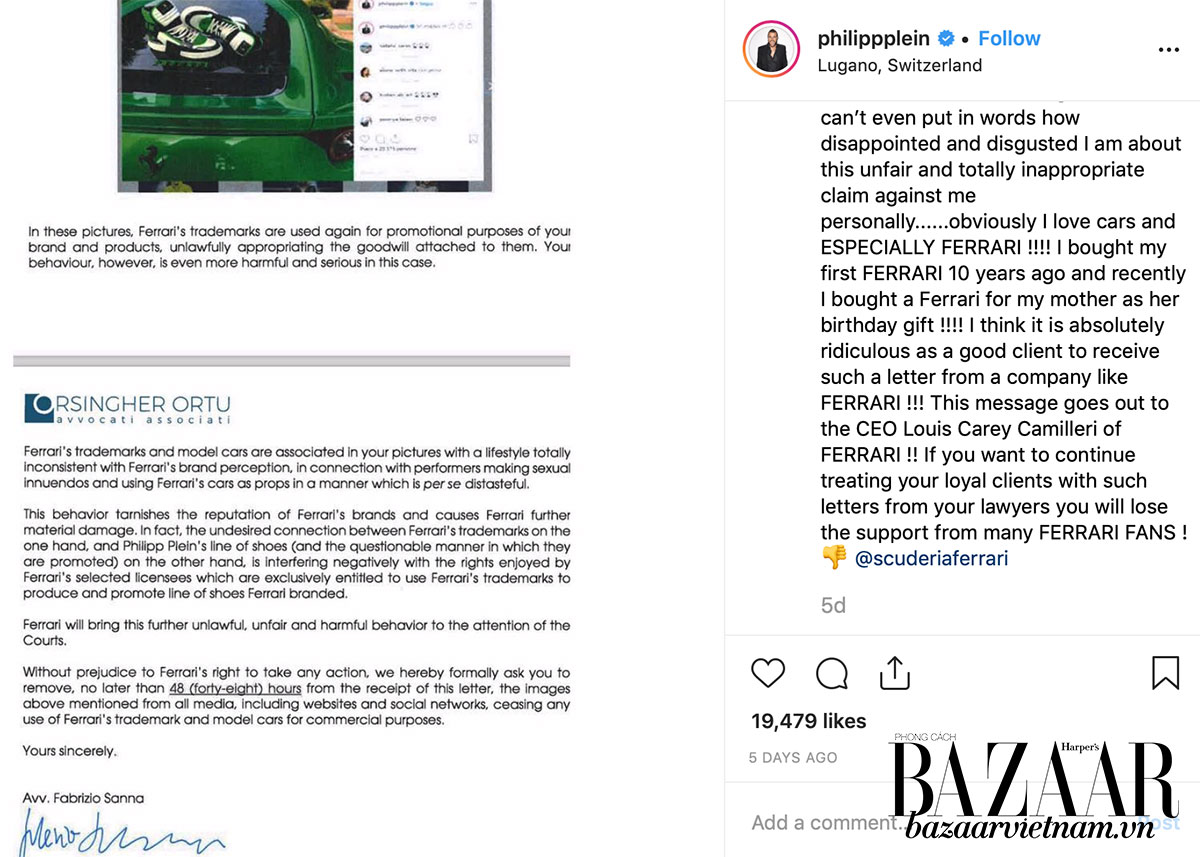 Cụ thể hơn, vào cuối năm 2019 “Phèn” đã chia sẻ hình ảnh, video các cô gái diện bikini, tạo dáng “rửa xe” cùng những mẫu mã siêu sang đến từ thương hiệu Lamborghini, Ferrari trên Instagram cá nhân. Và mọi chuyện chỉ hết vui khi Phèn bắt đầu đặt những đôi giày đầy tự hào của mình lên mui xe mà không biết rằng mình đã đụng phải “ổ kiến lửa” Ferrari. Ngay sau bức ảnh đó, Ferrari đã đâm đơn kiện chính “fan ruột” của mình rằng “nhà thiết kế” này đã ăn theo thương hiệu để bày tỏ phong cách sống g.ợi d.ục, khoe khoang khác hoàn toàn với phong cách của Ferrari sang trọng, lịch lãm. Đồng thời đó, thương hiệu này cũng yêu cầu Philipp Plein gỡ hết toàn bộ những video, hình ảnh ấy khỏi trang cá nhân.