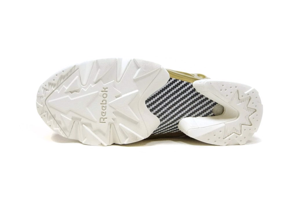 “Gold Metallic” cũng được sử dụng cho các tấm phủ xung quanh giày thể thao, bao phủ phần mũi giày, tấm chắn bùn, thân giày trước, cổ giày và sau đó là các phần tử bơm đầy không khí vào những lớp phủ đó. Có thể tìm thấy nhiều hình thêu màu vàng hơn trên lưỡi gà với chi tiết nội dung thương hiệu và tem chữ ký của Reebok, trong khi nút chuyển đổi áp suất Pump cũng được hiện diện trên lưỡi gà ngay giữa tấm phủ màu vàng. Có thể thấy tông màu này cực đẹp và sang trọng với ánh gold độc đáo hiếm thấy ở các đôi giày góp phần làm bật lên sự cá tính trong phong cách nó đem lại.