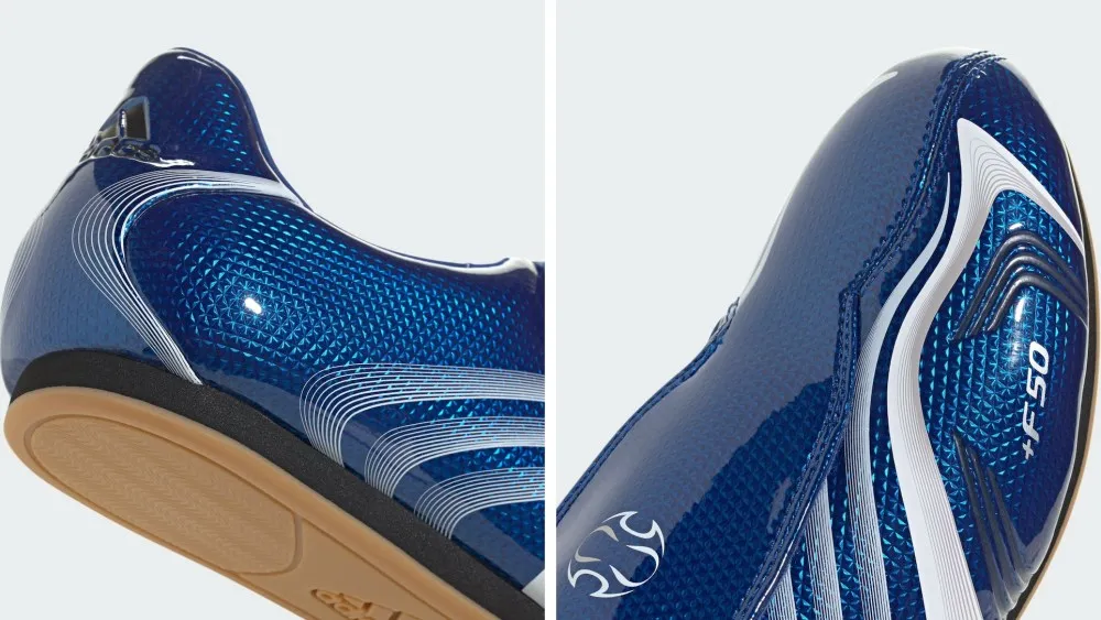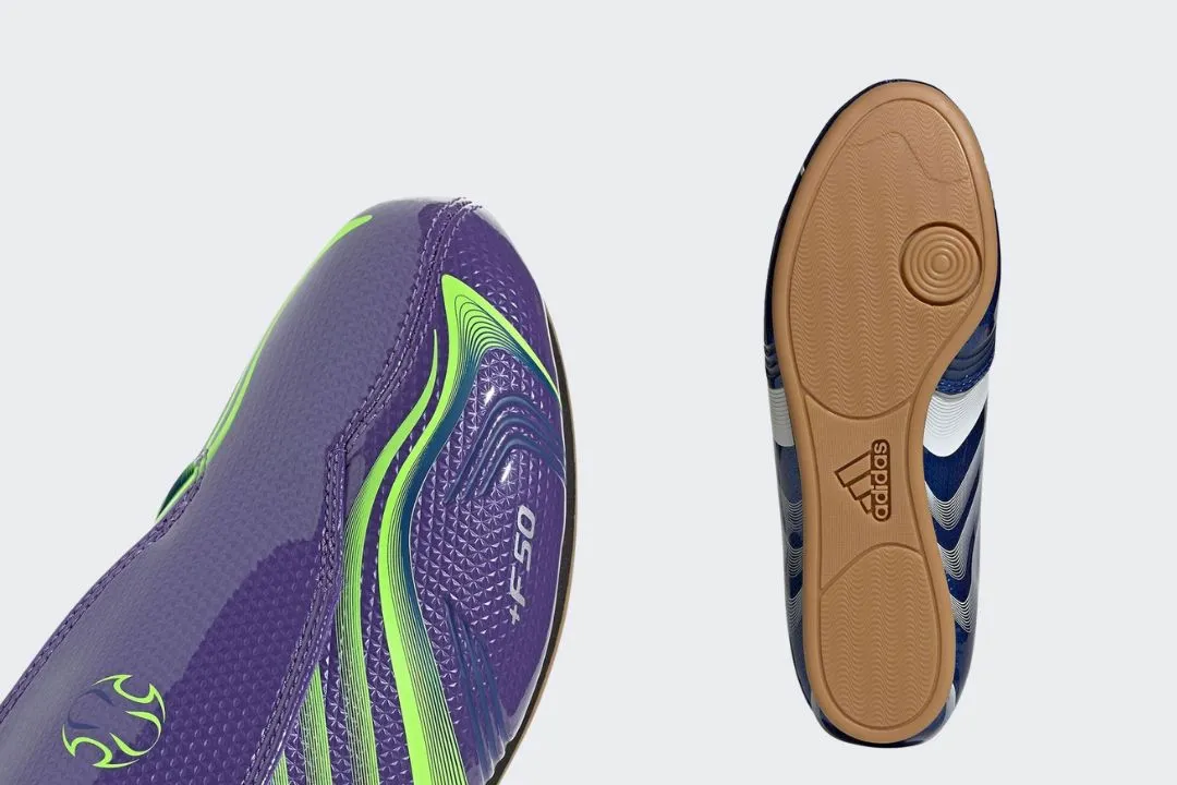 Không khó để nhận ra ảnh hưởng từ những đôi giày đá bóng huyền thoại của adidas trên thiết kế F50. Phần upper làm từ chất liệu tổng hợp bóng loáng cùng các họa tiết đồ họa sống động gợi nhớ đến các mẫu giày bóng đá cổ điển như Predator Megaride. Kết hợp với phần lace cover đặc trưng và logo adidas Football, đôi giày mang lại cảm giác như vừa bước ra từ sân cỏ. Tuy nhiên, sự khác biệt nằm ở chỗ: Taekwondo F50 không đi kèm đinh giày mà sở hữu đế bằng, đem đến sự tiện lợi và thoải mái cho người dùng trong cuộc sống hàng ngày.