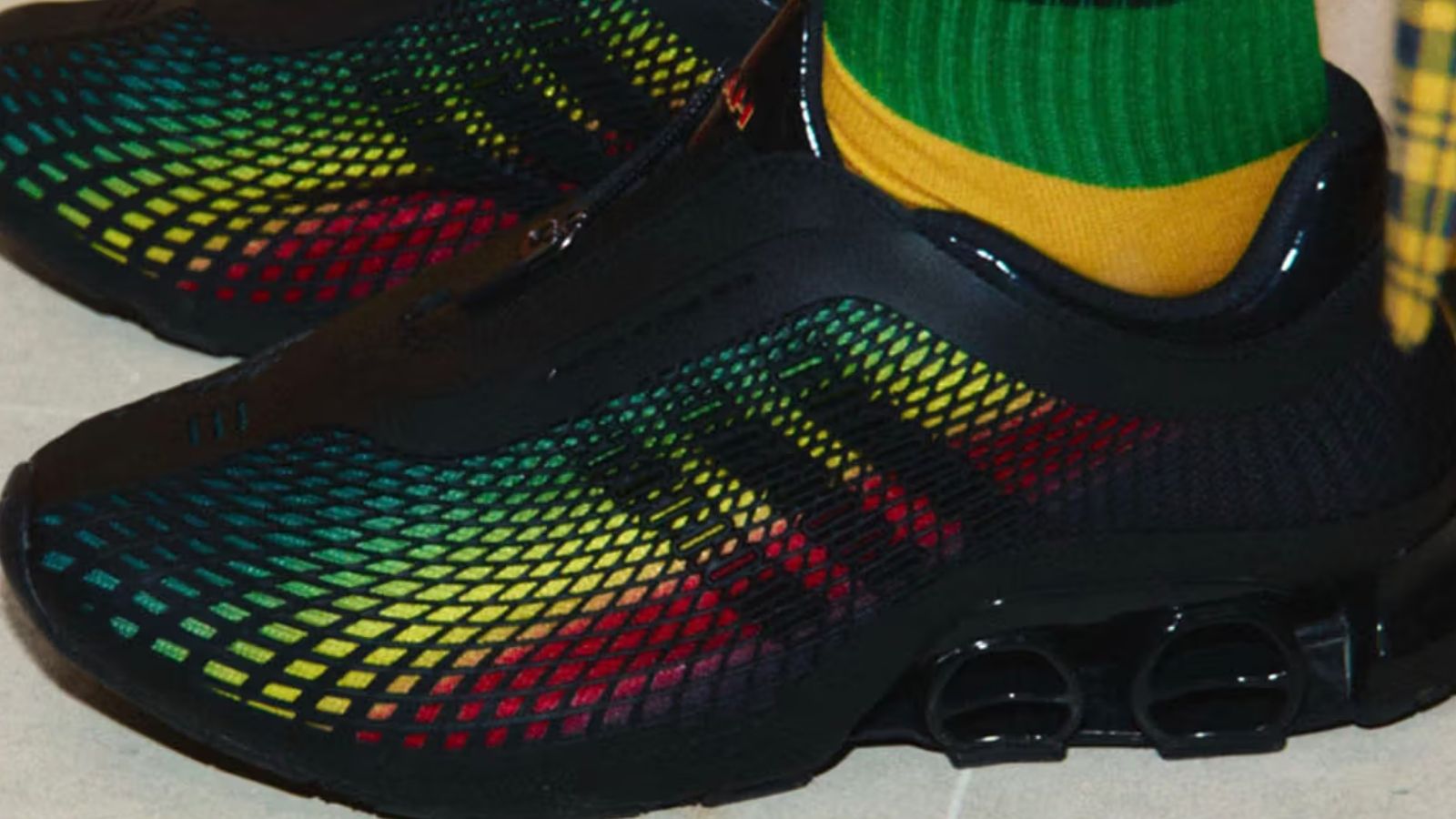 Lá cờ Ethiopia dường như được dệt nên từ dải màu chuyển sắc vàng-xanh-đỏ, được bao bọc và bảo vệ bởi một lớp lưới kim cương mạnh mẽ – cấu trúc cũng chính là biểu tượng Ba Sọc trứ danh. Chi tiết khóa kéo thay cho dây buộc là một tuyên ngôn về sự đổi mới, khẳng định rằng mỗi bước chân không chỉ êm ái nhờ công nghệ Megaride mà còn mang theo niềm tự hào về một di sản văn hóa.